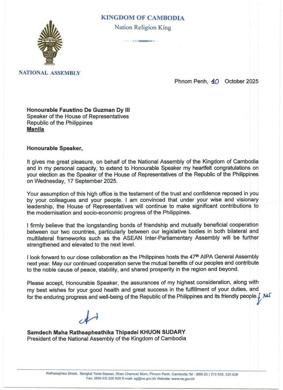 សម្តេចមហារដ្ឋសភាធិការធិបតី ឃួន សុដារី ប្រធានរដ្ឋសភានៃព្រះរាជាណាចក្រកម្ពុជា ផ្ញេីសារលិខិតអបអរសាទរ គោរពជូន ឯកឧត្តម ហ្វូស្ទីណូ ដឺ ហ្គូហ្សម៉ាន ឌី ទី៣ (Faustino De Guzman Dy III) ប្រធានរដ្ឋសភា នៃសាធារណរដ្ឋហ្វីលីពីន ក្នុងឱកាសដែល ឯកឧត្តម ត្រូវបានបោះឆ្នោតជ្រើសតាំងជា ប្រធានរដ្ឋសភា នៃសាធារណរដ្ឋហ្វីលីពីន កាលពីថ្ងៃពុធ ទី១៧ ខែកញ្ញា ឆ្នាំ២០២៥។