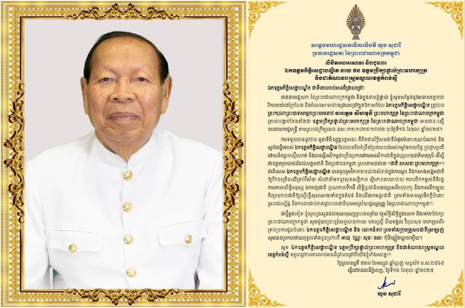 សម្តេចមហារដ្ឋសភាធិការធិបតី ឃួន សុដារី ប្រធានរដ្ឋសភានៃព្រះរាជាណាចក្រកម្ពុជា ផ្ញេីលិខិតអបអរសាទរ និងជូនពរ ឯកឧត្តមកិត្តិសេដ្ឋាបណ្ឌិត ឆាយ ថន ឧត្តមប្រឹក្សាផ្ទាល់ព្រះមហាក្សត្រ និងជាតំណាងរាស្ត្រមណ្ឌលខេត្តកំពង់ស្ពឺ ក្នុងឱកាសដែល ឯកឧត្តមកិត្តិសេដ្ឋាបណ្ឌិត ត្រូវបាន ព្រះករុណាព្រះបាទសម្តេចព្រះបរមនាថ នរោត្តម សីហមុនី ព្រះមហាក្សត្រ នៃព្រះរាជាណាចក្រកម្ពុជា ត្រាស់បង្គាប់តែងតាំងជា ឧត្តមប្រឹក្សាផ្ទាល់ព្រះមហាក្សត្រ នៃព្រះរាជាណាចក្រកម្ពុជា មានឋានៈស្មើ ឧបនាយករដ្ឋមន្ត្រី។