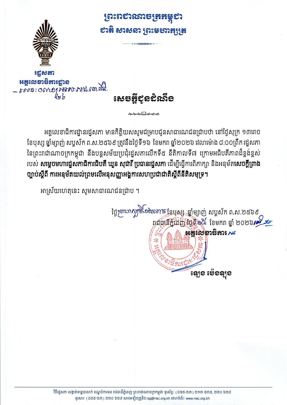 នៅព្រឹកថ្ងៃទី១៦ ខែមករាឆ្នាំ២០២៦ រដ្ឋសភានៃព្រះរាជាណាចក្រកម្ពុជា បានបន្តសម័យប្រជុំ រដ្ឋសភាលើកទី៥ និតិកាលទី៧ ក្រោមអធិបតីភាព សម្តេចមហារដ្ឋសភាធិការធិបតី ឃួន សុដារី ប្រធានរដ្ឋសភា ដើម្បីពិភាក្សាអនុម័ត សេចក្តីព្រាងច្បាប់យល់ព្រមលើអនុសញ្ញា អង្គការសហប្រជាជាតិស្ដីពីនីតិសមុទ។