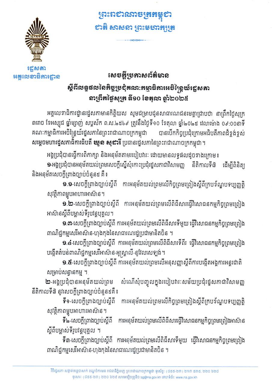 សេចក្ដីប្រកាសព័ត៌មាន ស្ដីពី លទ្ធផលនៃកិច្ចប្រជុំគណៈកម្មាធិការអចិន្ត្រៃយ៍រដ្ឋសភា នាព្រឹកថ្ងៃសុក្រ ទី១០ ខែតុលា ឆ្នាំ២០២៥