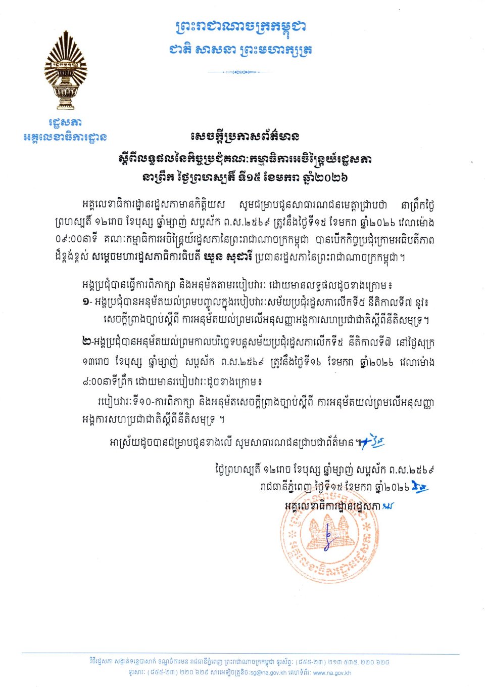 សេចក្ដីប្រកាសព័ត៌មាន ស្ដីពី លទ្ធផលនៃកិច្ចប្រជុំគណៈកម្មាធិការអចិន្ត្រៃយ៍រដ្ឋសភា នាព្រឹកថ្ងៃព្រហស្បតិ៍ ទី១៥ ខែមករា ឆ្នាំ២០២៦