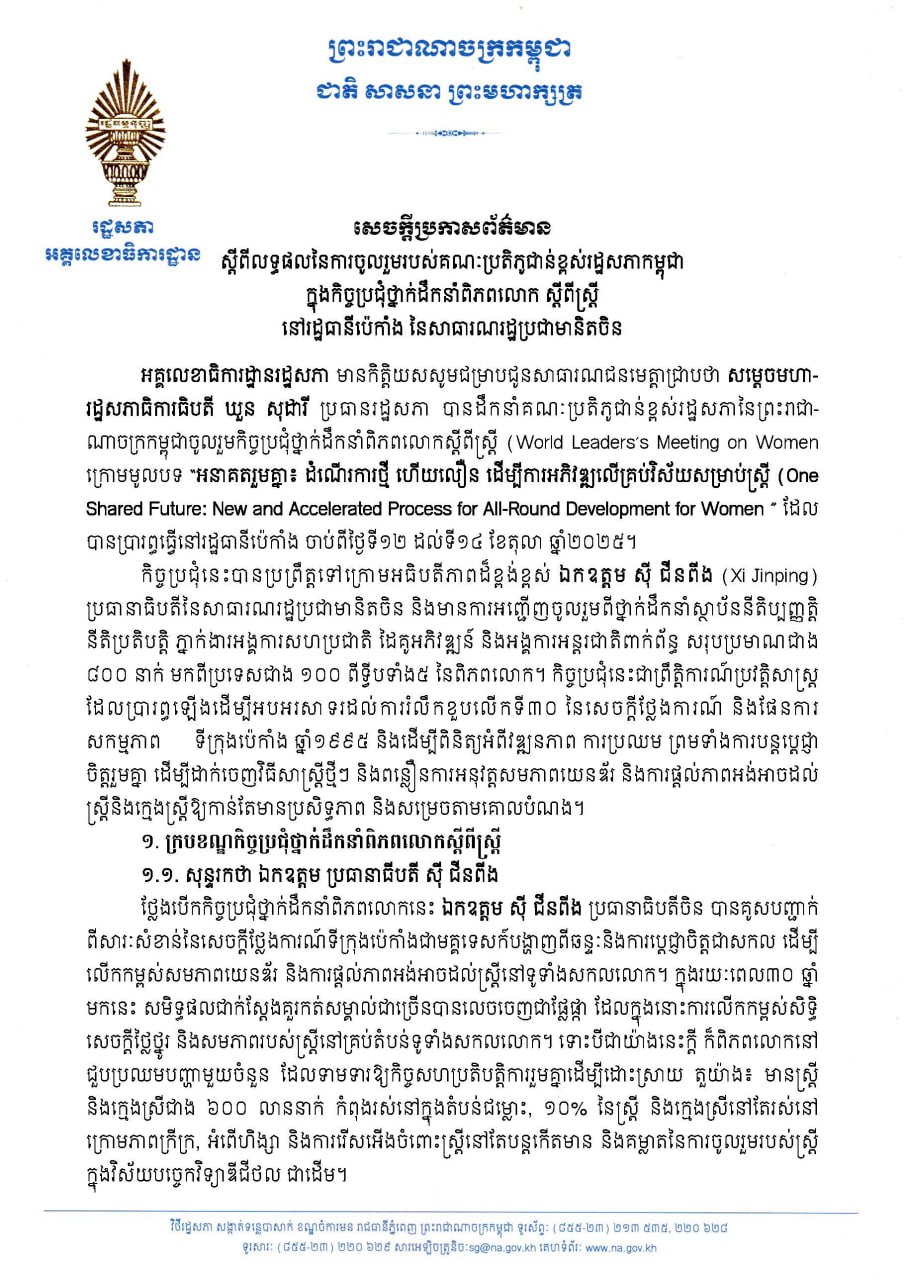 សេចក្តីប្រកាសព័ត៌មាន ស្តីពីលទ្ធផលនៃការចូលរួមរបស់គណៈប្រតិភូជាន់ខ្ពស់រដ្ឋសភាកម្ពុជា ក្នុងកិច្ចប្រជុំថ្នាក់ដឹកនាំពិភពលោក ស្តីពីស្រ្តី នៅរដ្ឋធានីប៉េកាំង នៃសាធារណរដ្ឋប្រជាមានិតចិន