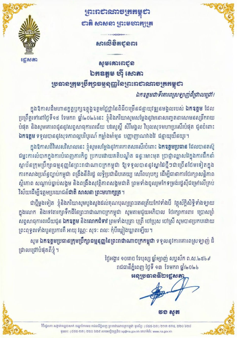 ឯកឧត្តម វង សូត អនុប្រធានទី២ នៃរដ្ឋសភា ផ្ញេីសារលិខិតជូនពរ សូមគោរពជូន ឯកឧត្តម ហ៊ី សោភា ប្រធានក្រុមប្រឹក្សាធម្មនុញ្ញនៃព្រះរាជាណាចក្រកម្ពុជា ក្នុងឱកាសដ៏មហានក្ខត្តឫក្សឧត្តុង្គឧត្តមថ្លៃថ្លានៃពិធីចម្រើនជន្មាយុវឌ្ឍនមង្គលរបស់ ឯកឧត្តម ដែលប្រព្រឹត្តទៅនៅថ្ងៃទី១៥ ខែមករា ឆ្នាំ២០២៦នេះ។