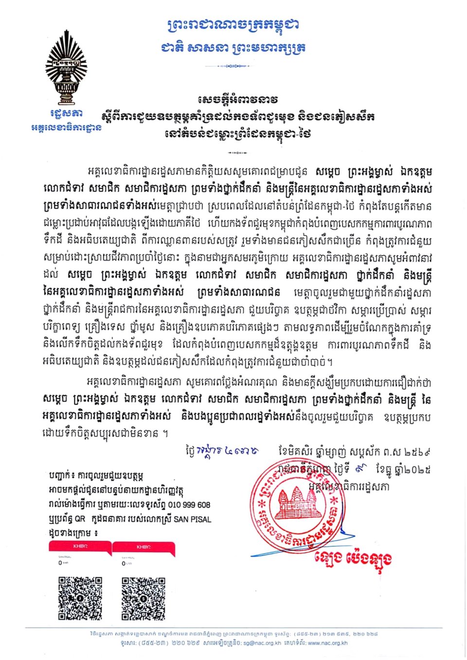 សេចក្តីអំពាវនាវ ស្តីពី ការជួយឧបត្ថម្ភគាំទ្រដល់កងទ័ពជួរមុខ និងជនភៀសសឹក នៅតំបន់ជម្លោះព្រំដែនកម្ពុជា-ថៃ