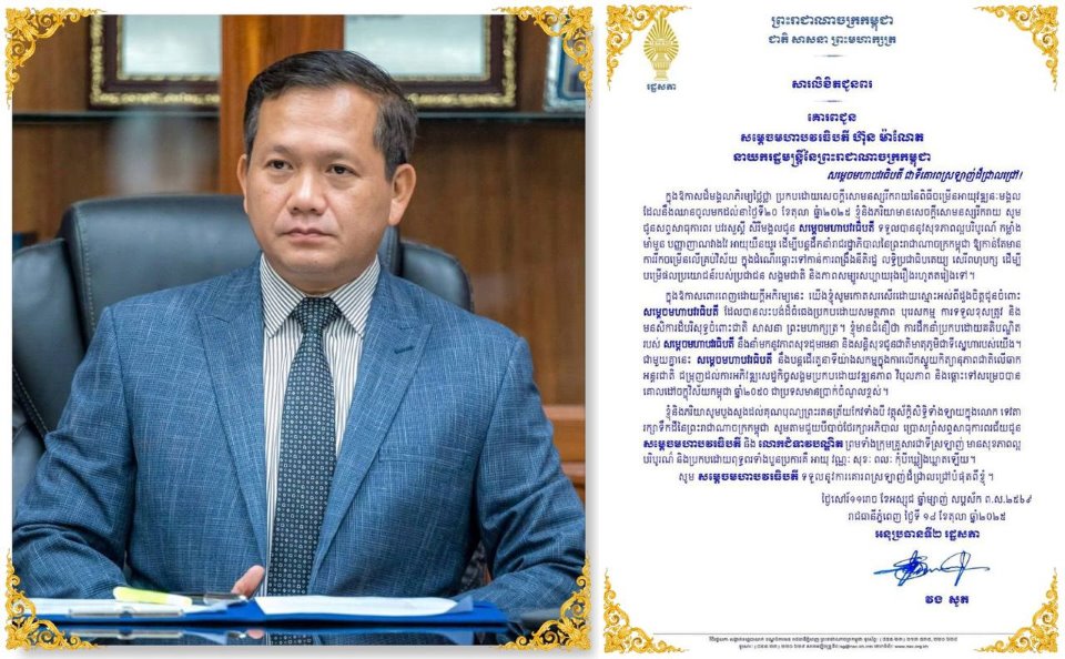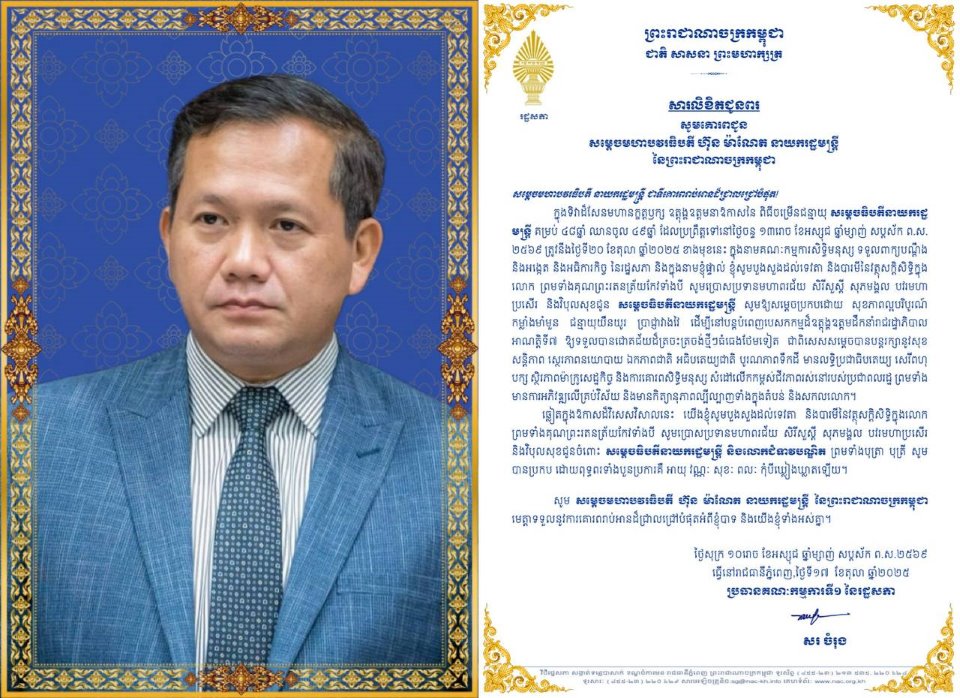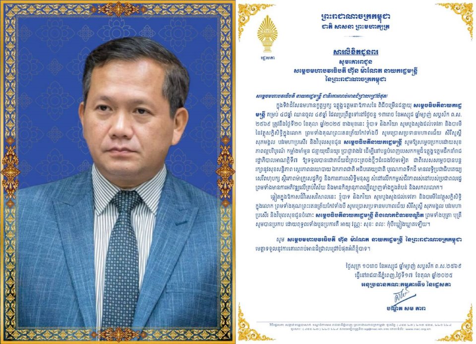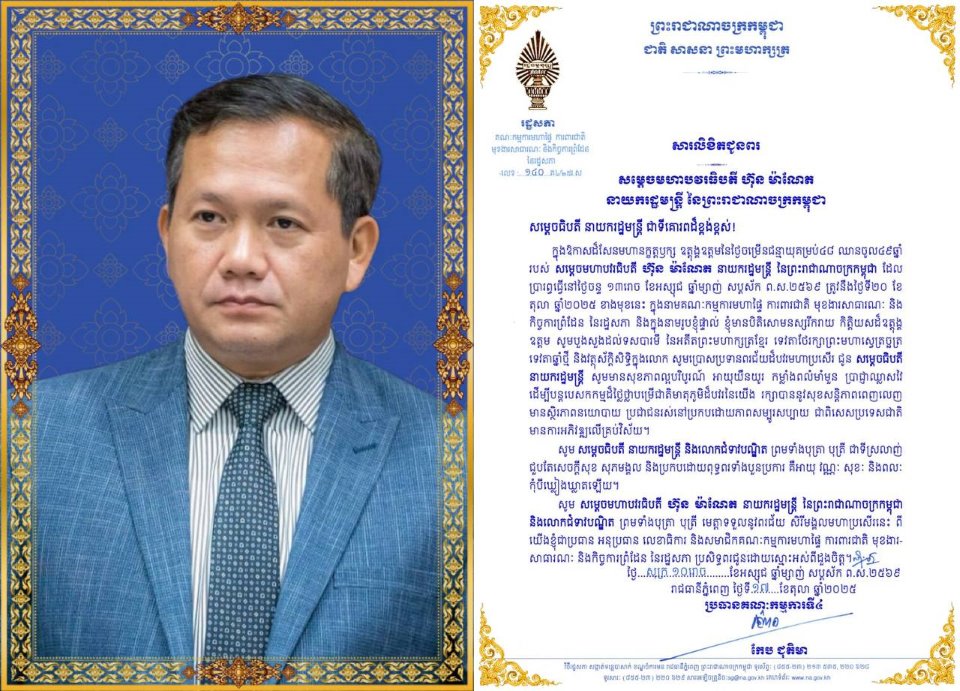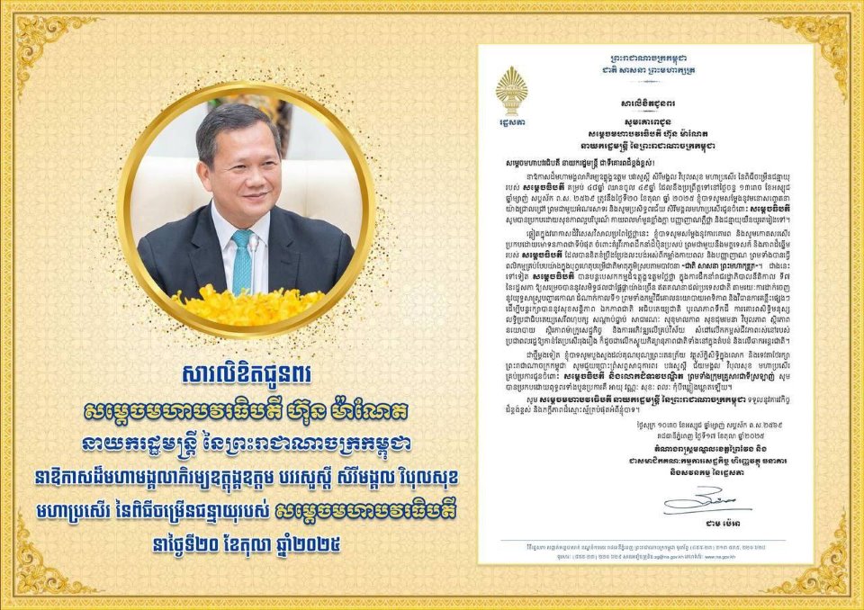 សម្តេចមហារដ្ឋសភាធិការធិបតី ឃួន សុដារី ប្រធានរដ្ឋសភា នៃព្រះរាជាណាចក្រកម្ពុជា ព្រមទាំងសមាជិក សមាជិការដ្ឋសភា ផ្ញើសារលិខិតជូនពរ សម្តេចមហាបវរធិបតី ហ៊ុន ម៉ាណែត នាយករដ្ឋមន្ត្រី នៃព្រះរាជាណាចក្រកម្ពុជា