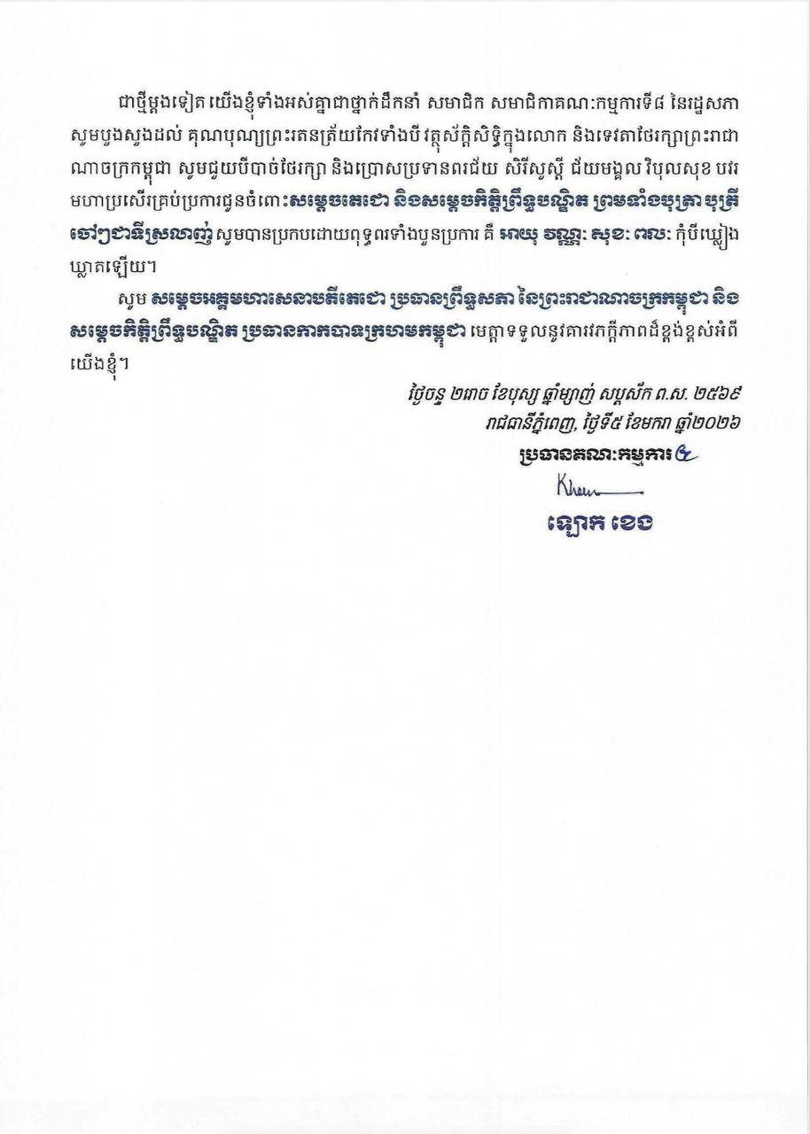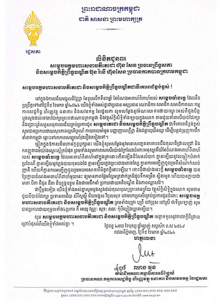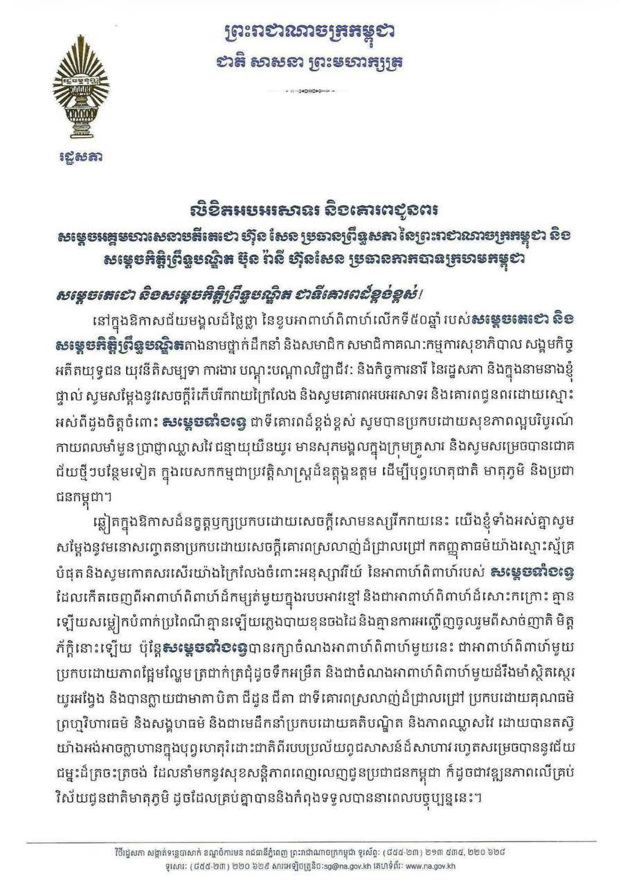 សម្តេចមហារដ្ឋសភាធិការធិបតី ឃួន សុដារី ប្រធានរដ្ឋសភា ព្រមទាំងថ្នាក់ដឹកនាំរដ្ឋសភា នៃព្រះរាជាណាចក្រកម្ពុជា ផ្ញើសារលិខិតជូនពរ សូមគោរពជូន សម្តេចអគ្គមហាសេនាបតីតេជោ ហ៊ុន សែន ប្រធានព្រឹទ្ធសភា នៃព្រះរាជាណាចក្រកម្ពុជា និងសម្តេចកិត្តិព្រឹទ្ធបណ្ឌិត ប៊ុនរ៉ានី ហ៊ុនសែន ប្រធានកាកបាទក្រហមកម្ពុជា