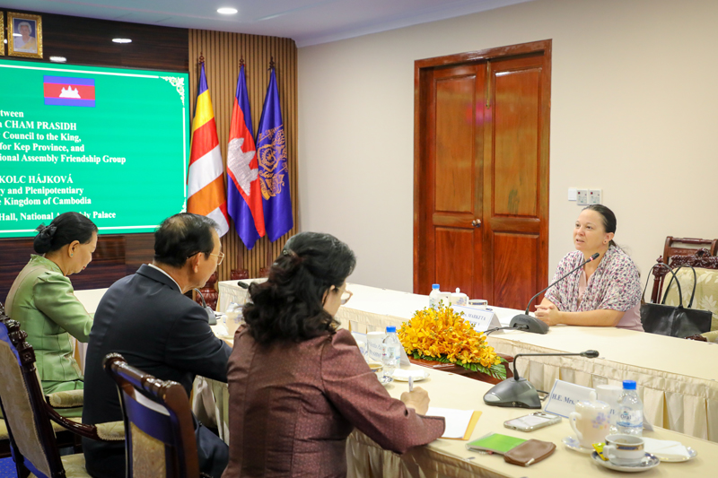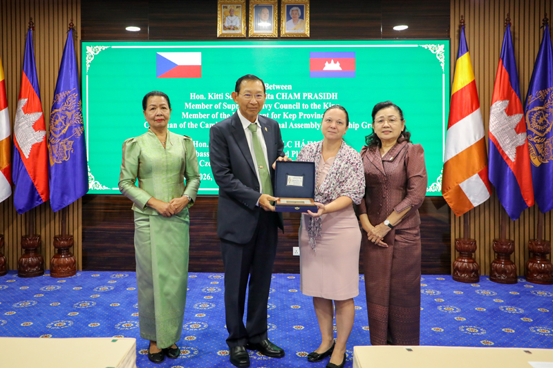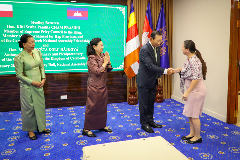 ឯកឧត្តមកិត្តិសេដ្ឋាបណ្ឌិត ចម ប្រសិទ្ធ ឧត្តមទីប្រឹក្សាផ្ទាល់ព្រះមហាក្សត្រ នៃព្រះរាជាណាចក្រកម្ពុជា និងជាប្រធានក្រុមមិត្តភាពរដ្ឋសភាកម្ពុជា- ឆែក នាព្រឹកថ្ងៃទី២៩ ខែមករា ឆ្នាំ២០២៦ បានជួបពិភាក្សាការងារជាមួយលោកជំទាវ ម៉ាកេតា កូល ហៃកូវ៉ា (Markéta Kolc Hájková) ឯកអគ្គរដ្ឋទូតឆែកនៅវិមានរដ្ឋសភា។