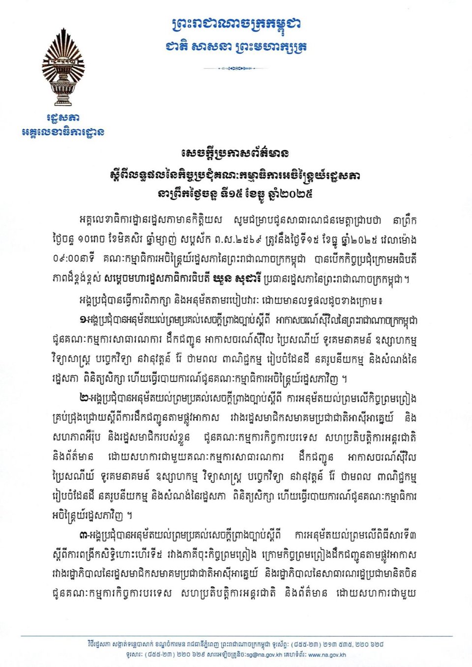 សេចក្ដីប្រកាសព័ត៌មាន ស្ដីពី លទ្ធផលនៃកិច្ចប្រជុំគណៈកម្មាធិការអចិន្ត្រៃយ៍រដ្ឋសភា នាព្រឹកថ្ងៃចន្ទ ទី១៥ ខែធ្នូ ឆ្នាំ២០២៥