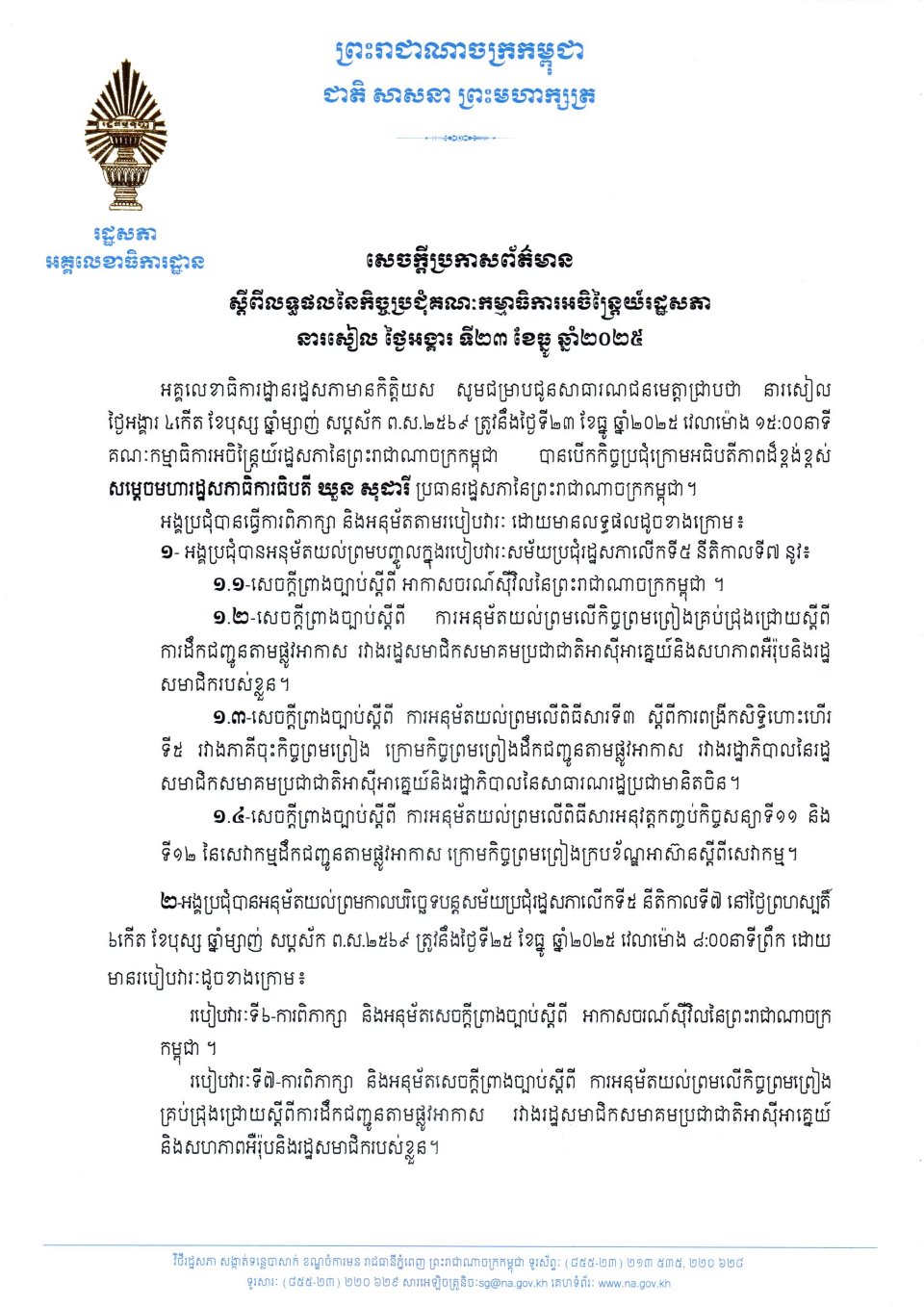 សេចក្តីប្រកាសព័ត៌មាន ស្តីពី លទ្ធផលនៃកិច្ចប្រជុំគណៈកម្មាធិការអចិន្ត្រៃយ៍រដ្ឋសភា នារសៀលថ្ងៃអង្គារ ទី២៣ ខែធ្នូ ឆ្នាំ២០២៥
