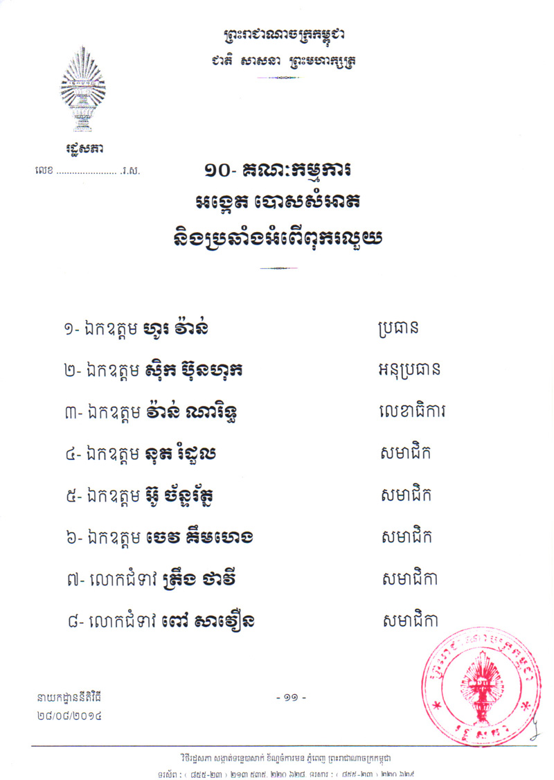 ១-រចនាសម្ព័ន្ធ ២-តួនាទី-ភារកិច្ច ៣-សកម្មភាព -គណ:ប្រតិភូ គណ:កម្មការទី១០នៃរដ្ឋសភាចុះបំពេញបេសកកម្មនៅ ខេត្តក្រចេះ ត្បូងឃ្មុំ និងខេត្តកំពង់ចាម( ២៦-០២-២០១៥ ) -គណៈកម្មការប្រឆាំង អំពើពុករលួយរដ្ឋសភា ចុះសិក្សាស្វែងយល់ការងារ ដែលពាក់ព័ន្ធ ភារកិច្ចគណៈកម្មការ នៅខេត្តព្រះសីហនុ -គណៈកម្មការទី១០ នៃរដ្ឋសភា ជួបពិភាក្សាជាមួយអង្គភាពប្រឆាំងអំពើពុករលួយ -ឯកឧត្តម ហូ វ៉ាន់ ប្រធានគណៈកម្មការទី១០ នៃរដ្ឋសភាអញ្ជើញ លោកស្រី ស៊ុយ សុផាន ចូលបំភ្លឺនៅវិមានរដ្ឋសភា -កិច្ចប្រជុំពិភាក្សាលើសេចក្តីស្នើច្បាប់ធម្មនុញ្ញ ស្តីពីវិសោធនកម្ម