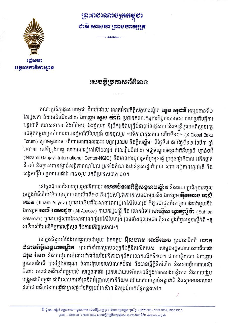 សេចក្តីប្រកាសព័ត៌មាន ស្តីពីលទ្ធផលនៃការចូលរួមសន្និសីទសភាអន្តរជាតិ ដើម្បីរំលឹកខួប៣០ឆ្នាំ នៃការអនុម័តរដ្ឋធម្មនុញ្ញនៃសាធារណរដ្ឋអាស៊ែបៃហ្សង់ នៅទីក្រុងបាគូ នៃសាធារណរដ្ឋអាស៊ែបៃហ្សង់