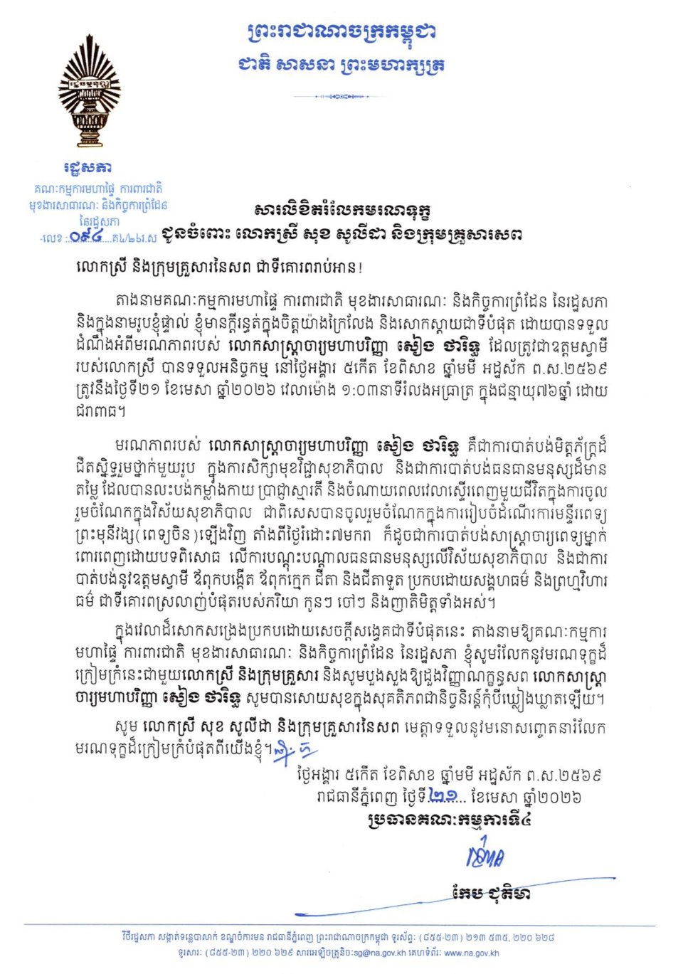 ឯកឧត្តម កែប ជុតិមា ប្រធានគណៈកម្មការទី៤ នៃរដ្ឋសភា ផ្ញេីសារលិខិតរំលែកមរណទុក្ខ ជូនចំពោះ លោកស្រី សុខ សូលីដា និងក្រុមគ្រួសារសព ចំពោះមរណភាពរបស់ លោកសាស្ត្រាចារ្យមហាបរិញ្ញា សៀង ថារិទ្ធ ដែលត្រូវជាឧត្តមស្វាមី របស់លោកស្រី បានទទួលអនិច្ចកម្ម នៅថ្ងៃអង្គារ ៥កើត ខែពិសាខ ឆ្នាំមមី អដ្ឋស័ក ព.ស.២៥៦៩ ត្រូវនឹងថ្ងៃទី២១ ខែមេសា ឆ្នាំ២០២៦ វេលាម៉ោង ១:០៣នាទីរំលងអធ្រាត្រ ក្នុងជន្មាយុ៧៦ឆ្នាំ ដោយជរាពាធ។