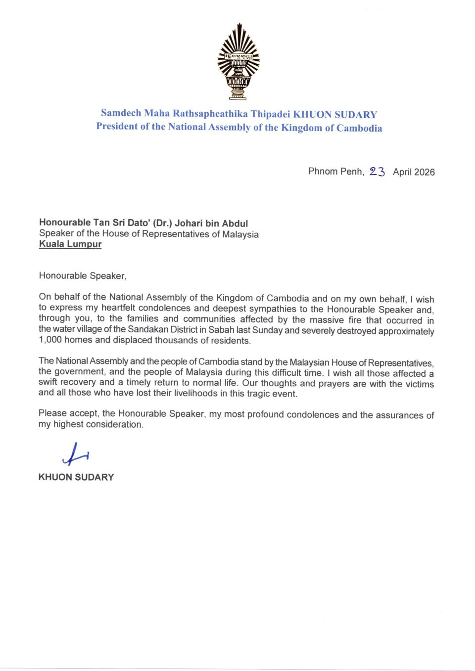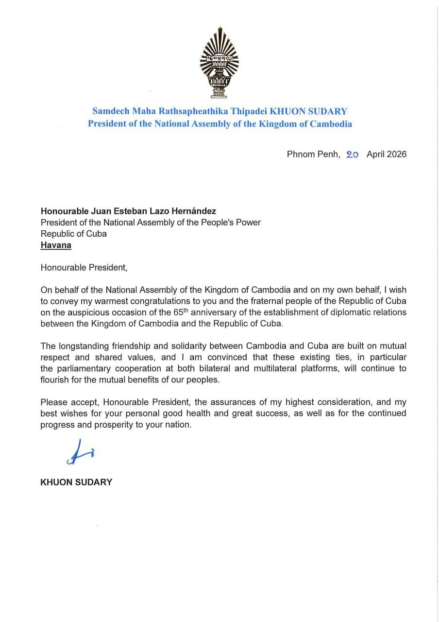 សម្តេចមហារដ្ឋសភាធិការធិបតី ឃួន សុដារី ប្រធានរដ្ឋសភា នៃព្រះរាជាណាចក្រកម្ពុជា ផ្ញេីសារលិខិតអបអរសាទរ គោរពជូន ឯកឧត្តម ជូន អេស្តេបាន ឡាសូ ហឺណានដែស (Juan Esteban Lazo Hernandez) ប្រធានរដ្ឋសភា អំណាចប្រជាជន នៃសាធារណរដ្ឋគុយបា និងជូនចំពោះ ប្រជាជន នៃសាធារណរដ្ឋគុយបា ក្នុងឱកាសដ៏វិសេសវិសាល នៃការប្រារព្ធខួបអនុស្សាវរីយ៍លើកទី៦៥ នៃការបង្កើតទំនាក់ទំនងការទូតរវាងព្រះរាជាណាចក្រកម្ពុជា និងសាធារណរដ្ឋគុយបា។