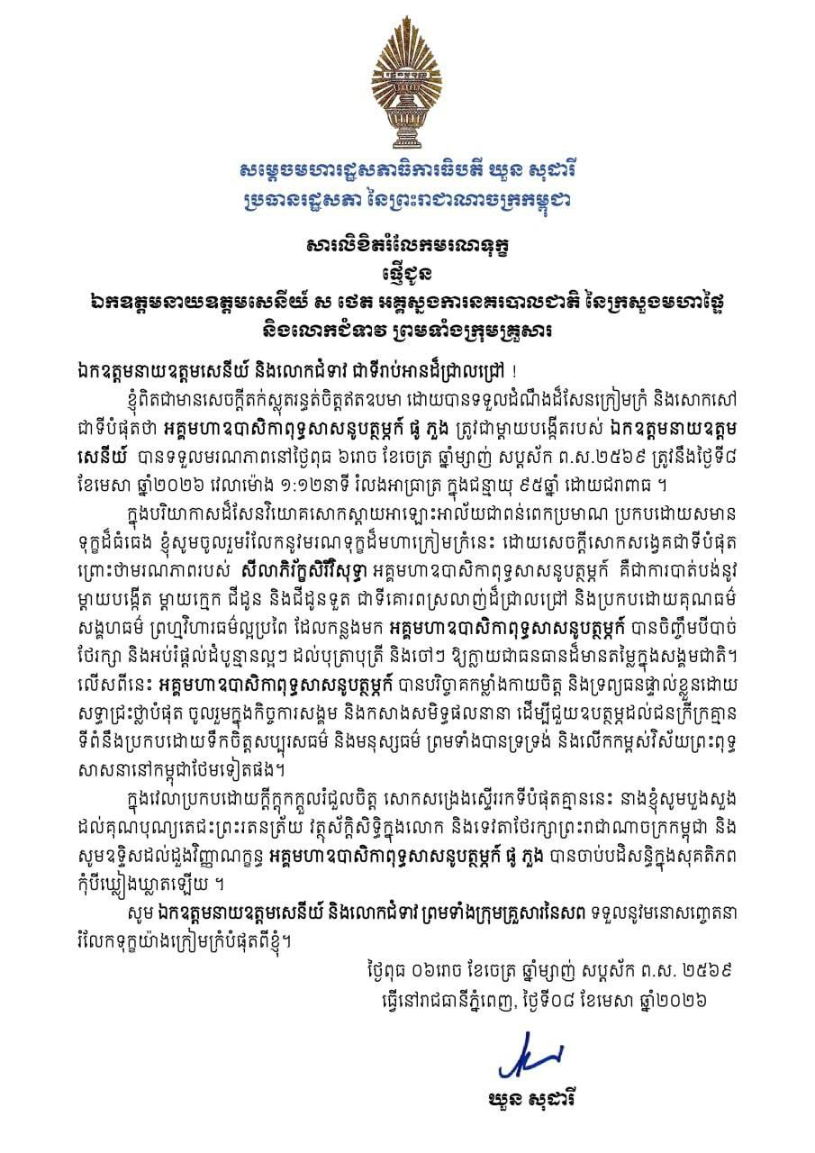 សម្តេចមហារដ្ឋសភាធិការធិបតី ឃួន សុដារី ប្រធានរដ្ឋសភា នៃព្រះរាជាណាចក្រកម្ពុជា ព្រមទាំងសមាជិក សមាជិការដ្ឋសភា ផ្ញើសារលិខិតរំលែកមរណទុក្ខ ជូន ឯកឧត្តមនាយឧត្តមសេនីយ៍ ស ថេត អគ្គស្នងការនគរបាលជាតិ នៃក្រសួងមហាផ្ទៃ និងលោកជំទាវ ព្រមទាំងក្រុមគ្រួសារ ចំពោះមរណភាពរបស់ អគ្គមហាឧបាសិកាពុទ្ធសាសនូបត្ថម្ភក៍ ផូ ភួង