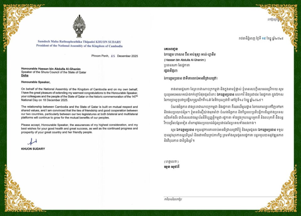 សម្តេចមហារដ្ឋសភាធិការធិបតី ឃួន សុដារី ប្រធានរដ្ឋសភា នៃព្រះរាជាណាចក្រកម្ពុជា ផ្ញើសារលិខិត អបអរសាទរ គោរពជូន ឯកឧត្តម ហាសាន ប៊ីន អាប់ឌូឡា អាល់-ហ្គានីម (Hassan bin Abdulla Al- Ghanim) ប្រធានសភា នៃរដ្ឋកាតា ព្រមទាំងជូនចំពោះ សហការី និងប្រជាជន នៃរដ្ឋកាតា ក្នុងឱកាស នៃការប្រារព្ធខួបជាប្រវត្តិសាស្ត្រលើកទី១៤៧ នៃទិវាបុណ្យជាតិ នៅថ្ងៃទី១៨ ខែធ្នូ ឆ្នាំ២០២៥។