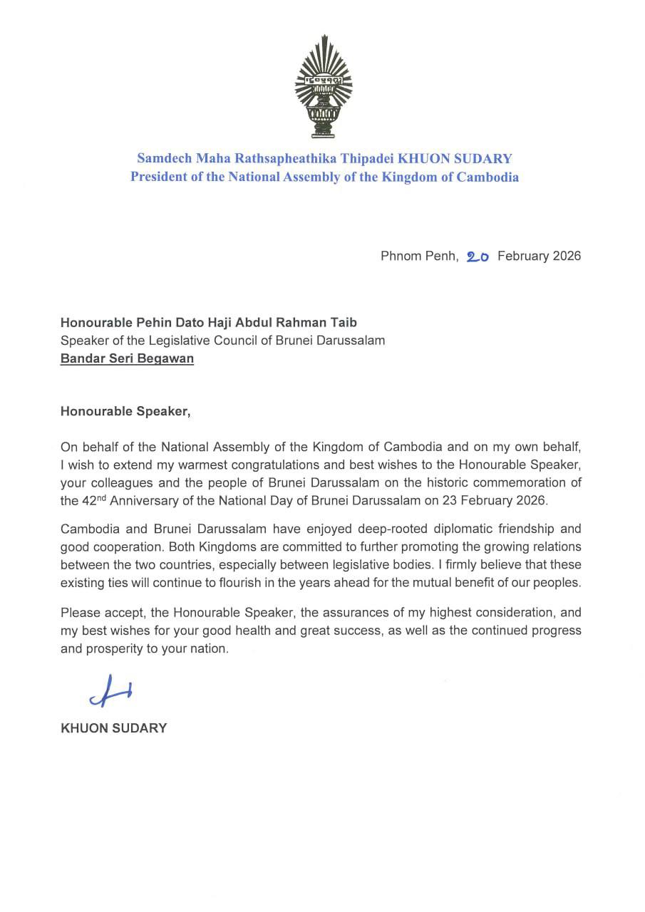 សម្តេចមហារដ្ឋសភាធិការធិបតី ឃួន សុដារី ប្រធានរដ្ឋសភា នៃព្រះរាជាណាចក្រកម្ពុជា ផ្ញេីសារលិខិតអបអរសាទរ និងជូនពរ គោរពជូន ឯកឧត្តម ផេហ៊ុន ដាតូ ហាជី អាប់ឌុល រ៉ាហ៍ម៉ាន តៃប (Pehin Dato Haji Abdul Rahman Taib) ប្រធានរដ្ឋសភា នៃប្រទេសប្រ៊ុយណេដារូសាឡឹម ព្រមទាំង ជូនចំពោះ សហការី និងប្រជាជន នៃប្រទេសប្រ៊ុយណេដារូសាឡឹម ក្នុងឱកាសប្រារព្ធ ខួបលើកទី៤២ នៃទិវាបុណ្យជាតិជាប្រវត្តិសាស្ត្រនៃប្រទេសប្រ៊ុយណេដារូសាឡឹម នៅថ្ងៃទី២៣ ខែកុម្ភៈ ឆ្នាំ២០២៦ ខាងមុខ។