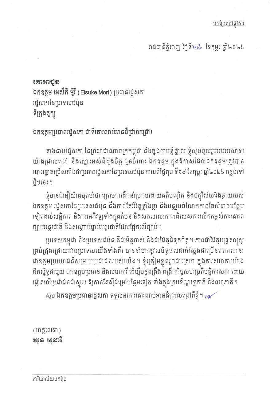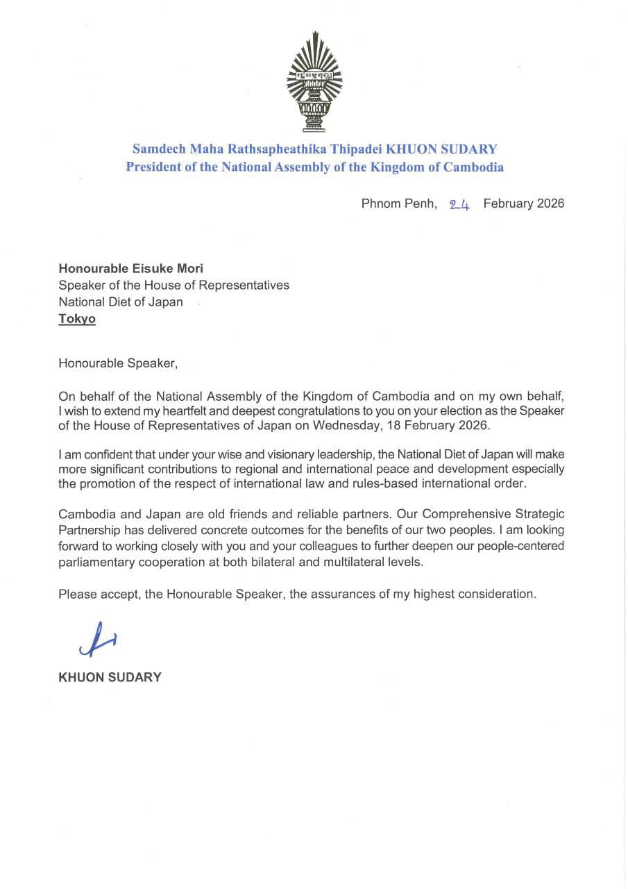 សម្តេចមហារដ្ឋសភាធិការធិបតី ឃួន សុដារី ប្រធានរដ្ឋសភា នៃព្រះរាជាណាចក្រកម្ពុជា ផ្ញេីសារលិខិតអបអរសាទរ គោរពជូន ឯកឧត្តម អេសឹកិ ម៉ូរី (Eisuke Mori) ប្រធានរដ្ឋសភានៃប្រទេសជប៉ុន ក្នុងឱកាសដែលឯកឧត្តមត្រូវបានបោះឆ្នោតជ្រើសតាំងជាប្រធានរដ្ឋសភានៃប្រទេសជប៉ុន កាលពីថ្ងៃពុធ ទី១៨ ខែកុម្ភៈ ឆ្នាំ២០២៦ កន្លងទៅថ្មីៗនេះ។