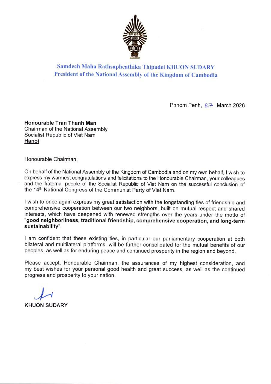 សម្តេចមហារដ្ឋសភាធិការធិបតី ឃួន សុដារី ប្រធានរដ្ឋសភា នៃព្រះរាជាណាចក្រកម្ពុជា ផ្ញេីសារលិខិតអបអរសាទរ គោរពជូន ឯកឧត្តម ជិន ថាញ់មិន (Tran Thanh Man) ប្រធានរដ្ឋសភានៃសាធារណរដ្ឋសង្គមនិយមវៀតណាម ព្រមទាំង ជូនចំពោះ សហការី និងប្រជាជនវៀតណាម ក្នុងឱកាសនៃការរៀបចំមហាសន្និបាតជាតិលើកទី១៤ នៃគណបក្សកុម្មុយនីស្តវៀតណាម ដែលបានបិតបញ្ចប់ដោយជោគជ័យយ៉ាងត្រចះត្រចង់។