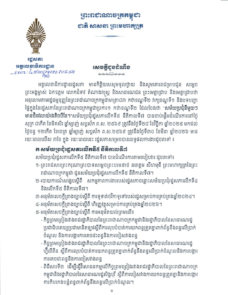 សេចក្តីជូនដំណឹង ស្តីពី លទ្ធផលការងារដែលរដ្ឋសភាសម្រេចបានក្នុងរយៈពេលសម័យប្រជុំរដ្ឋសភា លើកទី៥ នីតិកាលទី៧ មានរយៈពេលលើស ៣ខែ ដែលបានចាប់ផ្តើមដំណើរការនៅថ្ងៃសុក្រ ៨កើត ខែមិគសិរ ឆ្នាំម្សាញ់ សប្តស័ក ព.ស.២៥៦៩ ត្រូវនឹងថ្ងៃទី២៨ ខែវិច្ឆិកា ឆ្នាំ២០២៥ មកដល់ ថ្ងៃចន្ទ ១២កើត ខែចេត្រ ឆ្នាំម្សាញ់ សប្តស័ក ព.ស.២៥៦៩ ត្រូវនឹងថ្ងៃទី៣០ ខែមីនា ឆ្នាំ២០២៦។