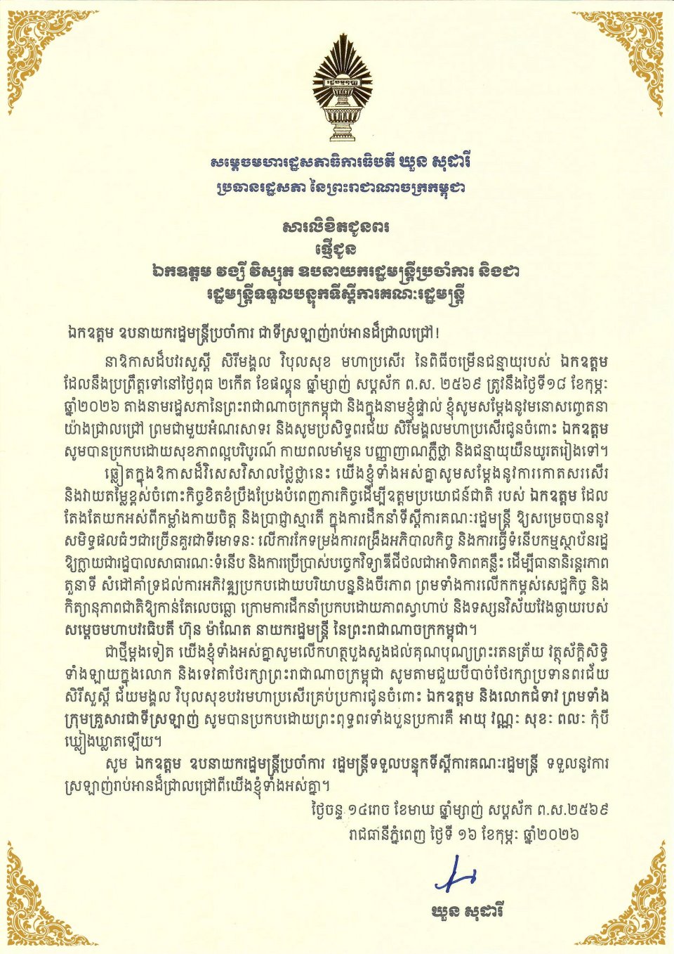 សម្តេចមហារដ្ឋសភាធិការធិបតី ឃួន សុដារី ប្រធានរដ្ឋសភា ព្រមទាំងថ្នាក់ដឹកនាំរដ្ឋសភា នៃព្រះរាជាណាចក្រកម្ពុជា ផ្ញើសារលិខិតជូនពរ ជូន ឯកឧត្តម វង្សី វិស្សុត ឧបនាយករដ្ឋមន្ត្រីប្រចាំការ និងជារដ្ឋមន្ត្រីទទួលបន្ទុកទីស្តីការគណៈរដ្ឋមន្ត្រី នាឱកាសដ៏បវរសួស្តី សិរីមង្គល វិបុលសុខ មហាប្រសើរ នៃពិធីចម្រើនជន្មាយុរបស់ ឯកឧត្តម ដែលនឹងប្រព្រឹត្តទៅ នៅថ្ងៃពុធ ២កើត ខែផល្គុន ឆ្នាំម្សាញ់ សប្តស័ក ព.ស. ២៥៦៩ ត្រូវនឹងថ្ងៃទី១៨ ខែកុម្ភៈ ឆ្នាំ២០២៦ ខាងមុខនេះ។