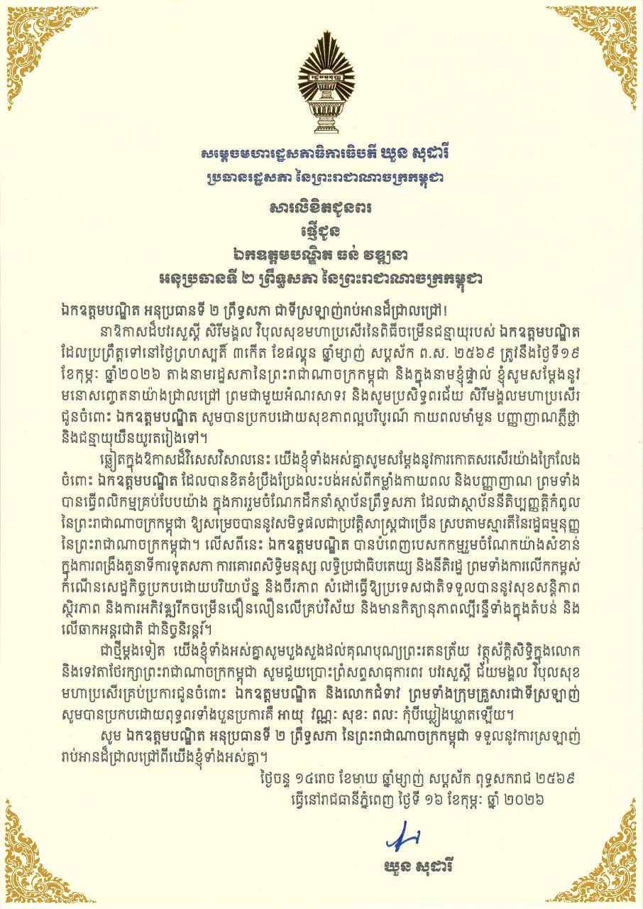 សម្តេចមហារដ្ឋសភាធិការធិបតី ឃួន សុដារី ប្រធានរដ្ឋសភា ព្រមទាំងថ្នាក់ដឹកនាំរដ្ឋសភា នៃព្រះរាជាណាចក្រកម្ពុជា ផ្ញើសារលិខិតជូនពរ ជូន ឯកឧត្តមបណ្ឌិត ធន់ វឌ្ឍនា អនុប្រធានទី២ ព្រឹទ្ធសភា នៃព្រះរាជាណាចក្រកម្ពុជា នាឱកាសដ៏បវរសួស្តី សិរីមង្គល វិបុលសុខមហាប្រសើរនៃពិធីចម្រើនជន្មាយុរបស់ ឯកឧត្តមបណ្ឌិត ដែលប្រព្រឹត្តទៅ នៅថ្ងៃព្រហស្បតិ៍ ៣កើត ខែផល្គុន ឆ្នាំម្សាញ់ សប្តស័ក ព.ស. ២៥៦៩ ត្រូវនឹងថ្ងៃទី១៩ ខែកុម្ភៈ ឆ្នាំ២០២៦ ខាងមុខនេះ។