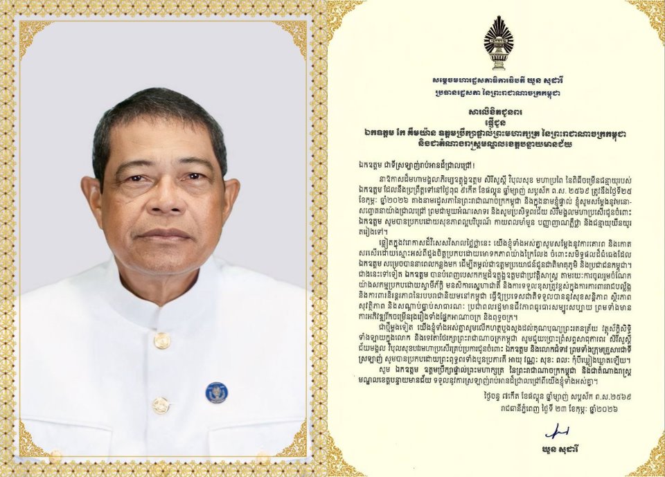 សម្តេចមហារដ្ឋសភាធិការធិបតី ឃួន សុដារី ប្រធានរដ្ឋសភា ព្រមទាំងថ្នាក់ដឹកនាំរដ្ឋសភា នៃព្រះរាជាណាចក្រកម្ពុជា ផ្ញើសារលិខិតជូនពរ ជូន ឯកឧត្តម កែ គឹមយ៉ាន ឧត្តមប្រឹក្សាផ្ទាល់ព្រះមហាក្សត្រ នៃព្រះរាជាណាចក្រកម្ពុជា និងជាតំណាងរាស្ត្រមណ្ឌលខេត្តបន្ទាយមានជ័យ នាឱកាសដ៏មហាមង្គលាភិរម្យឧត្តុង្គឧត្តម សិរីសួស្តី វិបុលសុខ មហាប្រពៃ នៃពិធីចម្រើនជន្មាយុរបស់ ឯកឧត្តម ដែលនឹងប្រព្រឹត្តទៅនាពេលខាងមុខ។