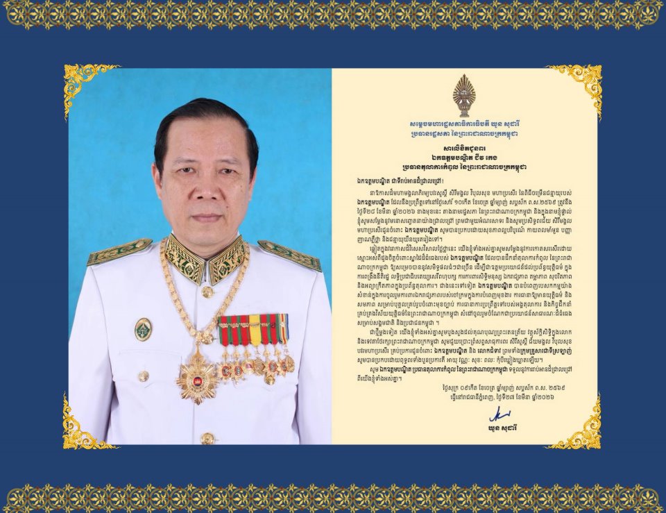 សម្តេចមហារដ្ឋសភាធិការធិបតី ឃួន សុដារី ប្រធានរដ្ឋសភា ព្រមទាំង សមាជិក សមាជិការដ្ឋសភា នៃព្រះរាជាណាចក្រកម្ពុជា ផ្ញើសារលិខិតជូនពរ ឯកឧត្តមបណ្ឌិត ជីវ កេង ប្រធានតុលាការកំពូល នាឱកាសដ៏មហាមង្គលាភិរម្យបវរសួស្តី សិរីមង្គល វិបុលសុខ មហាប្រសើរ នៃពិធីចម្រើនជន្មាយុរបស់ ឯកឧត្តមបណ្ឌិត។