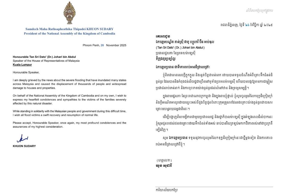 សម្តេចមហារដ្ឋសភាធិការធិបតី ឃួន សុដារី ប្រធានរដ្ឋសភា នៃព្រះរាជាណាចក្រកម្ពុជា ផ្ញេីសារលិខិតចូលរួមរំលែកទុក្ខ គោរពជូន ឯកឧត្តមបណ្ឌិត តាន់ស្រ៊ី ដាតូ ហ្សូហារី ប៊ីន អាប់ឌុល (Tan Sri Dato' (Dr.) Johari bin Abdul) ប្រធានរដ្ឋសភា នៃប្រទេសម៉ាឡេស៊ី និងជូនចំពោះក្រុមគ្រួសារដែលរងគ្រោះទឹកជំនន់ដ៏ធ្ងន់ធ្ងរ ដែលបាននឹងកំពុងជន់លិចរដ្ឋជាច្រើននៅទូទាំង ប្រទេសម៉ាឡេស៊ី ហើយបានបង្កឱ្យមានការជម្លៀស ប្រជាជនរាប់ពាន់នាក់ និងការខូចខាតយ៉ាងធ្ងន់ធ្ងរដល់លំនៅឋាន និងទ្រព្យសម្បត្តិ។