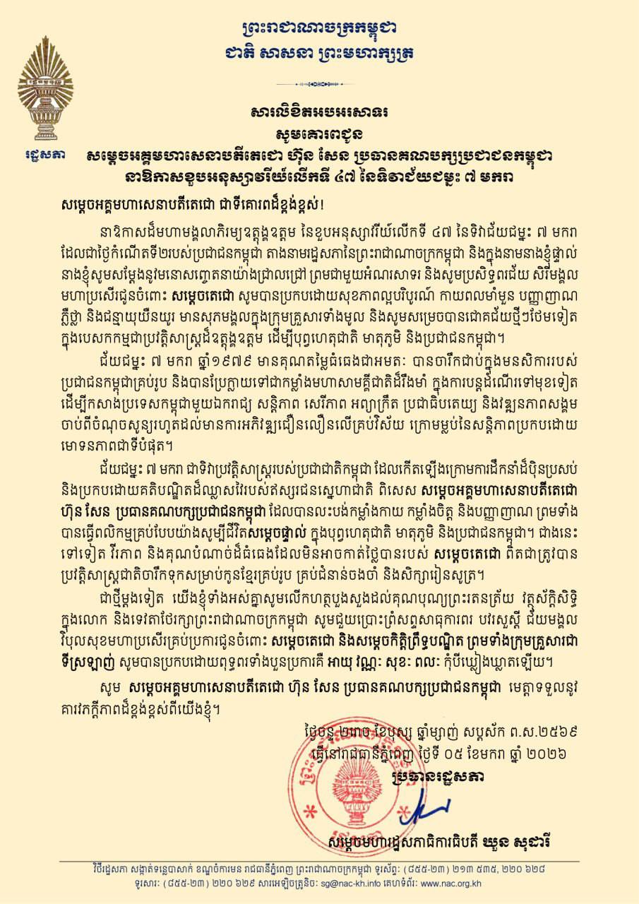 សម្តេចមហារដ្ឋសភាធិការធិបតី ឃួន សុដារី ប្រធានរដ្ឋសភា នៃព្រះរាជាណាចក្រកម្ពុជា ផ្ញេីសារលិខិតអបអរសាទរ នាឱកាសខួបអនុស្សាវរីយ៍លើកទី៤៧ នៃទិវាជ័យជម្នះ ៧មករា