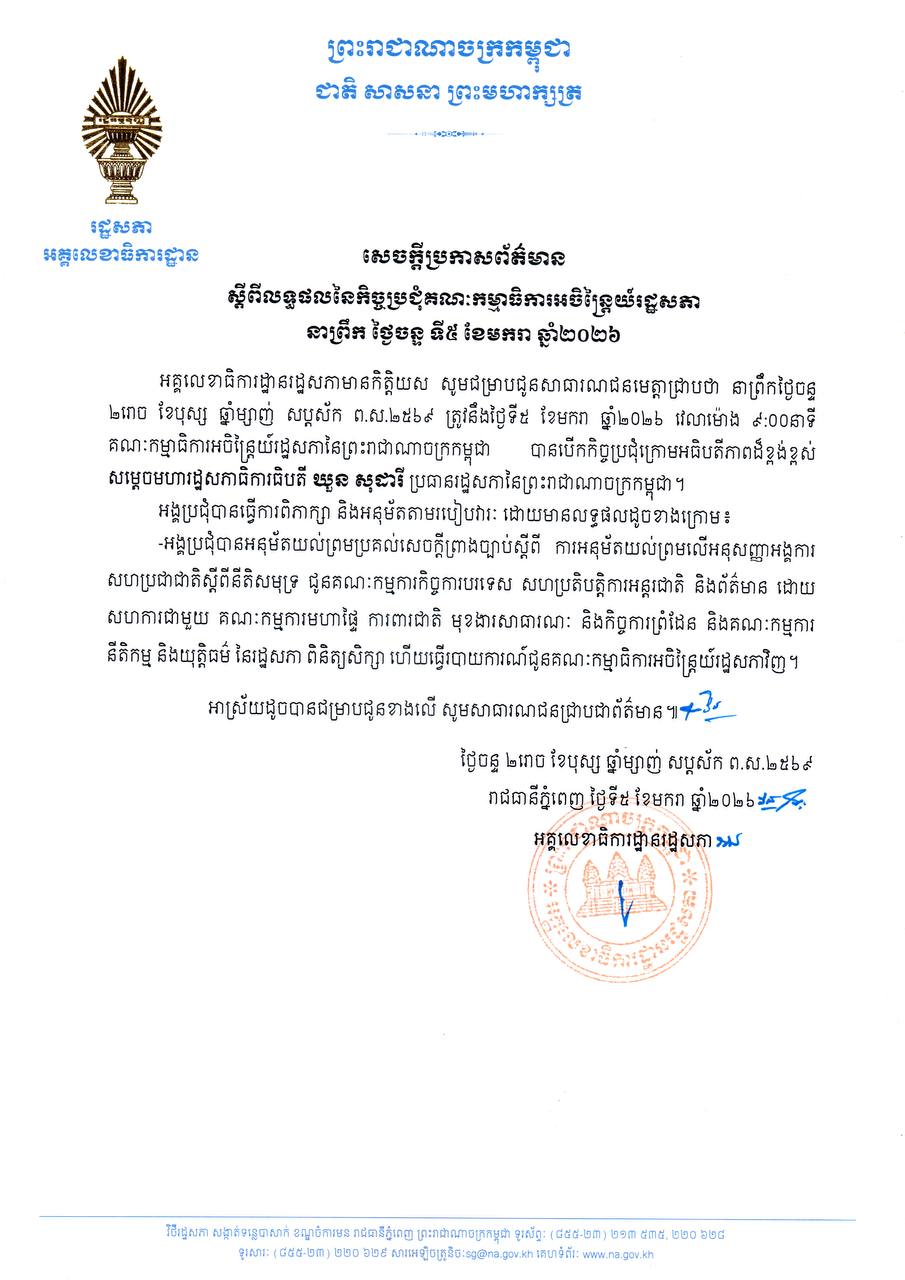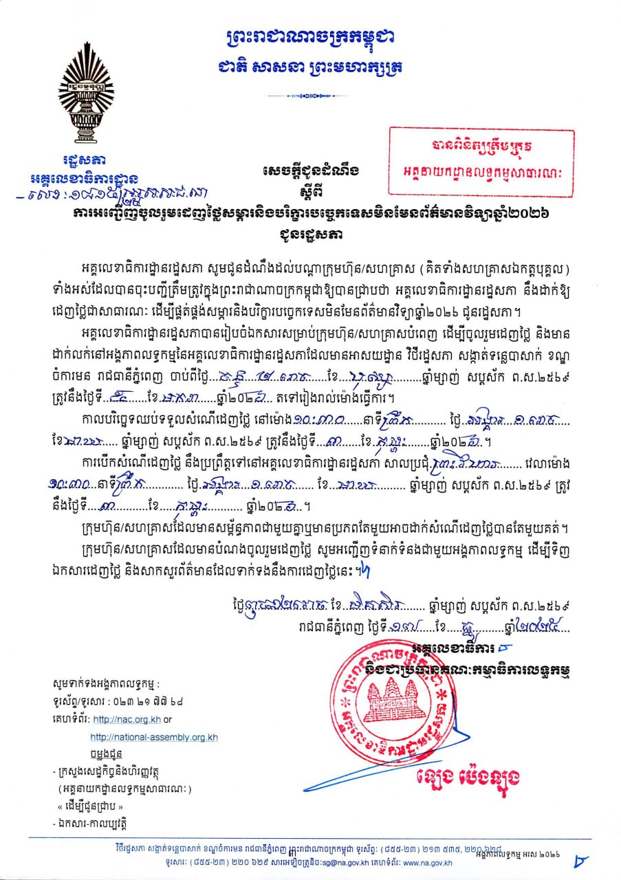 សេចក្តីជូនដំណឹង ស្តីពី ការអញ្ជើញចូលរួមដេញថ្លៃសម្ភារ និងបរិក្ខារបច្ចេកទេសមិនមែនព័ត៌មានវិទ្យាឆ្នាំ២០២៦ ជូនរដ្ឋសភា