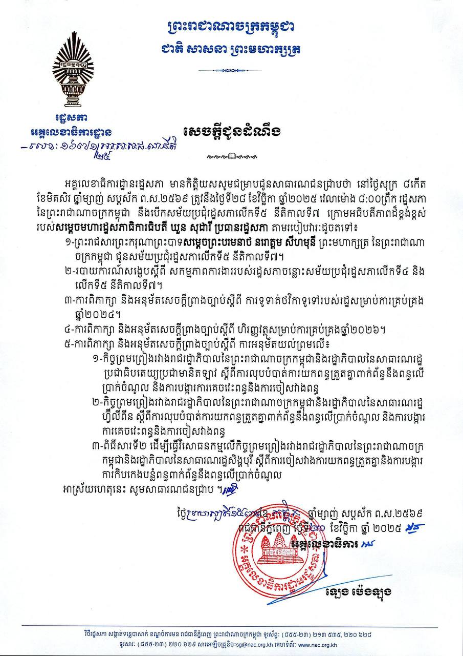 សេចក្តីជូនដំណឹង ស្ដីពី រដ្ឋសភានៃព្រះរាជាណាចក្រកម្ពុជានឹងបើកសម័យប្រជុំលើកទី៥ នីតិកាលទី៧ នៅព្រឹកថ្ងៃទី២៨ ខែវិច្ឆិកា ឆ្នាំ២០២៥
