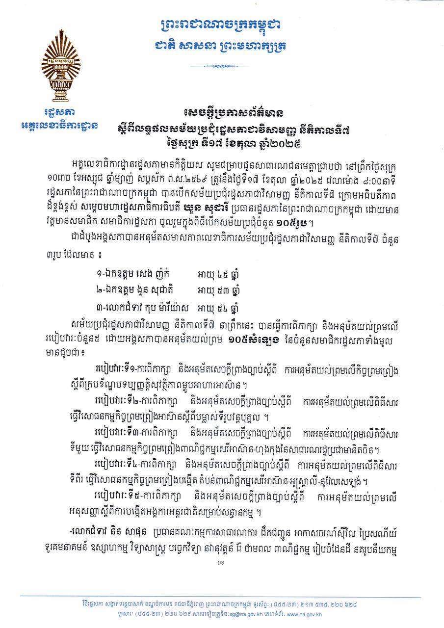 សេចក្ដីប្រកាសព័ត៌មាន ស្ដីពី លទ្ធផលសម័យប្រជុំរដ្ឋសភាជាវិសាមញ្ញ នីតិកាលទី៧ ថ្ងៃសុក្រ ទី១៧ ខែតុលា ឆ្នាំ២០២៥