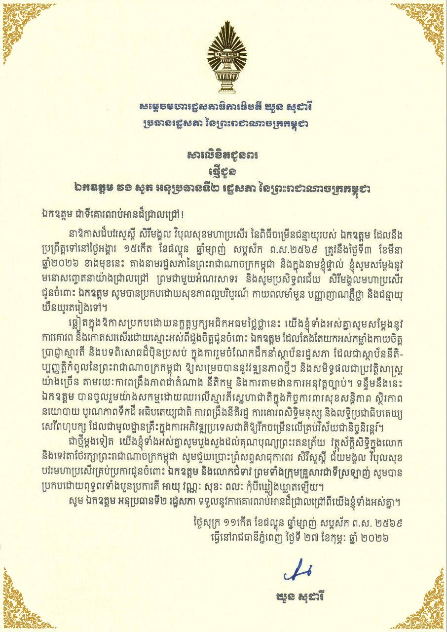 សម្តេចមហារដ្ឋសភាធិការធិបតី ឃួន សុដារី ប្រធានរដ្ឋសភា នៃព្រះរាជាណាចក្រកម្ពុជា ព្រមទាំង សមាជិក សមាជិការដ្ឋសភា ផ្ញើសារលិខិតជូនពរ ជូន ឯកឧត្តម វង សូត អនុប្រធានទី២ រដ្ឋសភា នាឱកាស នៃពិធីចម្រើនជន្មាយុរបស់ ឯកឧត្តម ដែលនឹងប្រព្រឹត្តទៅ នៅថ្ងៃអង្គារ ១៥កើត ខែផល្គុន ឆ្នាំម្សាញ់ សប្តស័ក ព.ស.២៥៦៩ ត្រូវនឹងថ្ងៃទី៣ ខែមីនា ឆ្នាំ២០២៦ ខាងមុខនេះ។