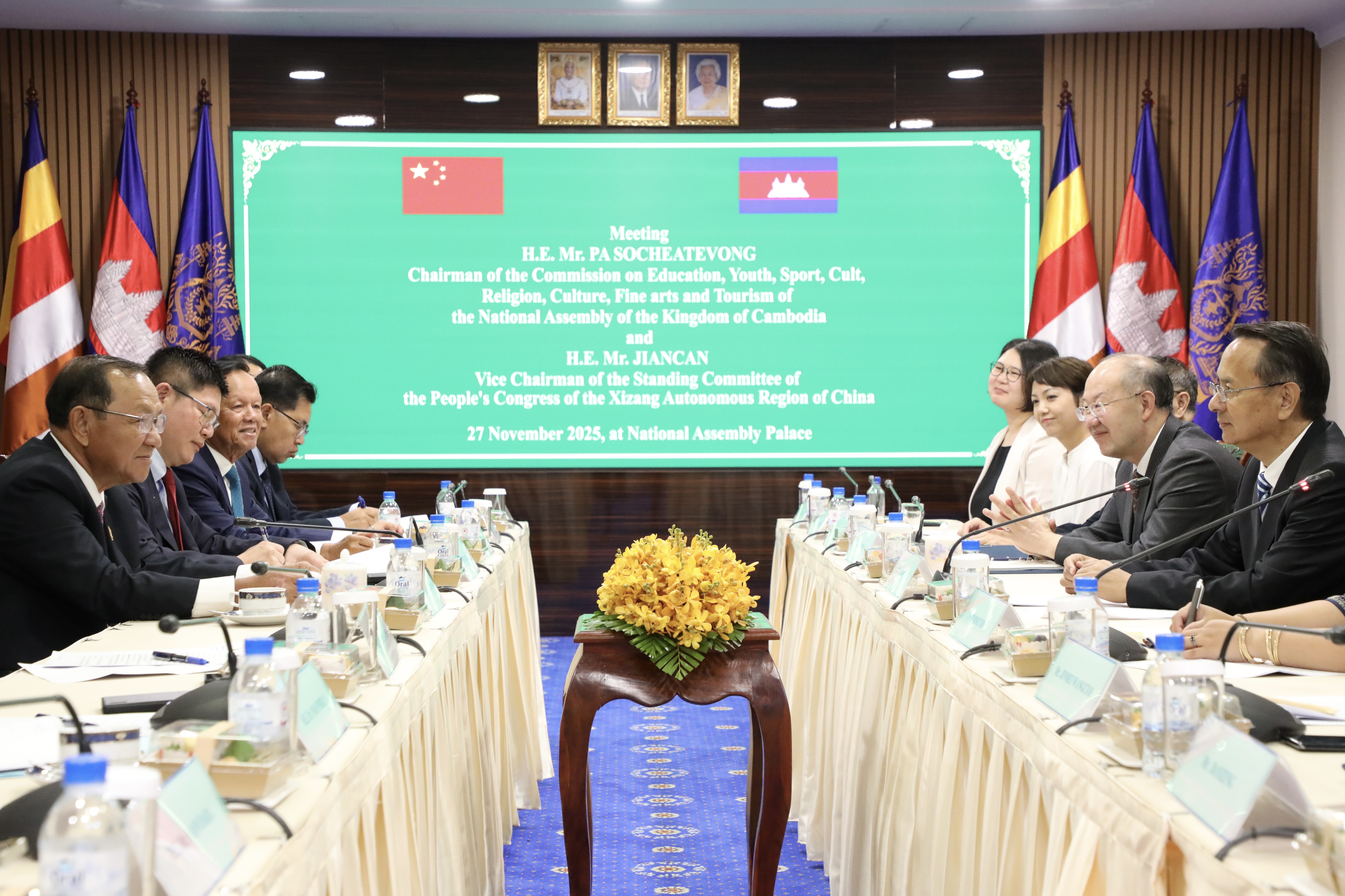 ឯកឧត្តម ប៉ា សុជាតិវង្ស ប្រធានគណៈកម្មការអប់រំ យុវជន កីឡា ធម្មការសាសនា វប្បធម៌ វិចិត្រសិល្បៈ និងទេសចរណ៍ (គណៈកម្មការទី៧)នៃរដ្ឋសភា បានជួបពិភាក្សាការងារជាមួយ ឯកឧត្តម ជៀន ឆាន (JIANCAN) អនុប្រធានគណៈកម្មាធិការអចិន្ត្រៃយ៍ នៃសភាតំណាងប្រជាជនចិនតំបន់ស្វយ័តស៊ីចាង (Xizang) នៃសាធារណរដ្ឋប្រជាមានិតចិន នាព្រឹកថ្ងៃទី២៧ ខែវិច្ឆិកា ឆ្នាំ២០២៥ នៅវិមានរដ្ឋសភា។