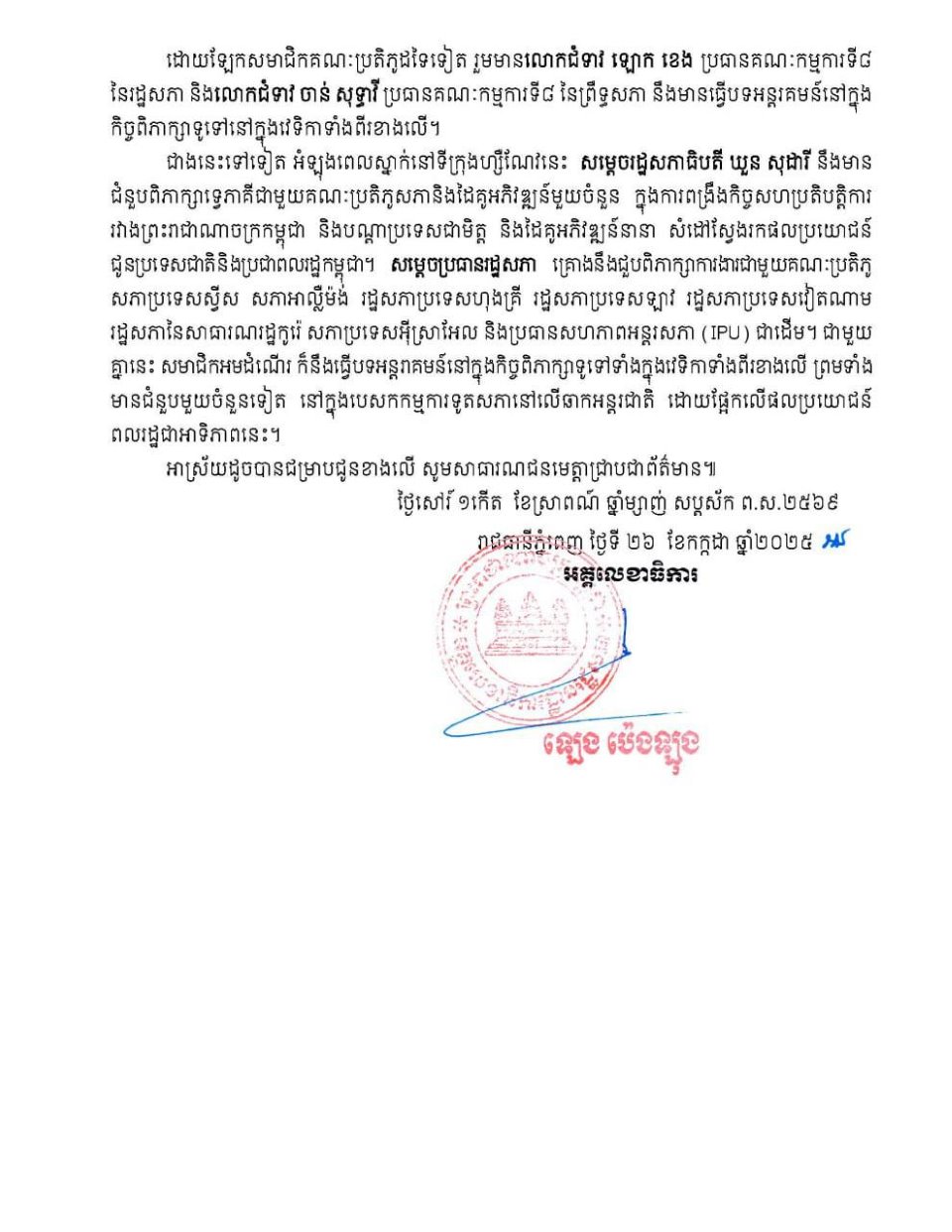 សេចក្តីជូនដំណឹង សម្តេចមហារដ្ឋសភាធិការធិបតី ឃួន សុដារី អញ្ជើញដឹកនាំគណៈប្រតិភូជាន់ខ្ពស់សភាកម្ពុជា ចូលរួមកិច្ចប្រជុំកំពូលប្រធានសភាស្រ្តីលើកទី១៥ និងសន្និសីទប្រធានសភាពិភពលោកលើកទី៦ នៅទីក្រុងហ្សឺណែវ ប្រទេសស្វីស