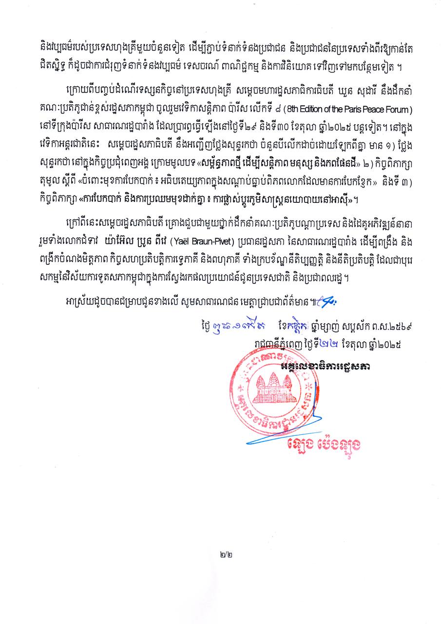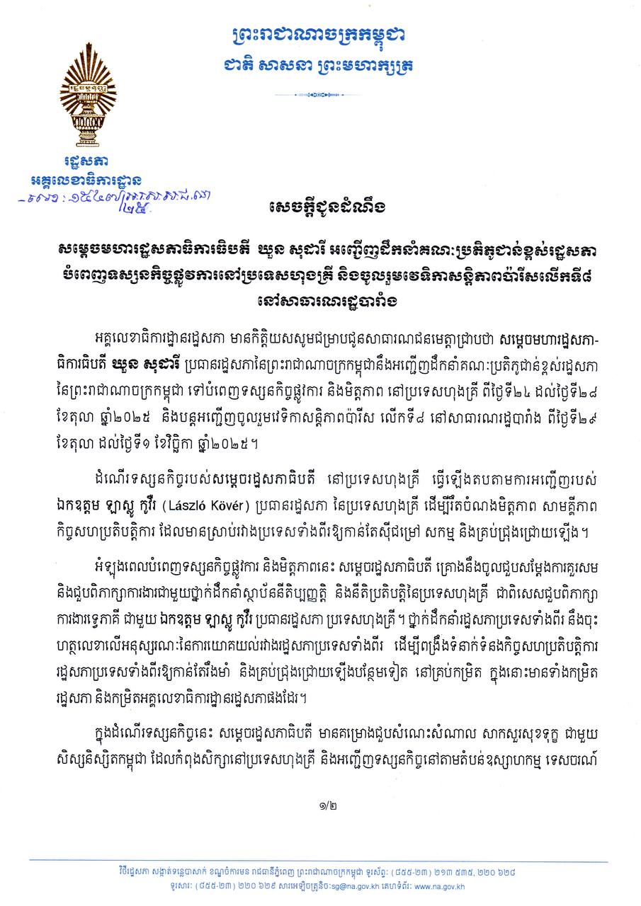 សេចក្តីជូនដំណឹង សម្តេចមហារដ្ឋសភាធិការធិបតី ឃួន សុដារី ប្រធានរដ្ឋសភា នៃព្រះរាជាណាចក្រកម្ពុជា នឹងអញ្ជើញដឹកនាំគណៈប្រតិភូជាន់ខ្ពស់រដ្ឋសភា បំពេញទស្សនកិច្ចផ្លូវការនៅប្រទេសហុងគ្រី និងចូលរួមវេទិកាសន្តិភាពប៉ារីសលើកទី៨ នៅសាធារណរដ្ឋបារាំង