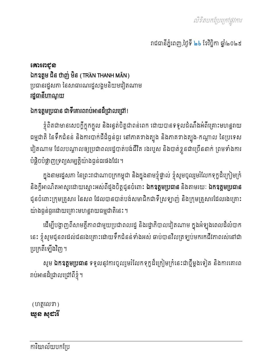 សម្តេចមហារដ្ឋសភាធិការធិបតី ឃួន សុដារី ប្រធានរដ្ឋសភា នៃព្រះរាជាណាចក្រកម្ពុជា ផ្ញេីសារលិខិតចូលរួមរំលែកទុក្ខ គោរពជូន ឯកឧត្តម ជិន ថាញ់ មិន (TRẦN THANH MẪN) ប្រធានរដ្ឋសភា នៃសាធារណរដ្ឋសង្គមនិយមវៀតណាម