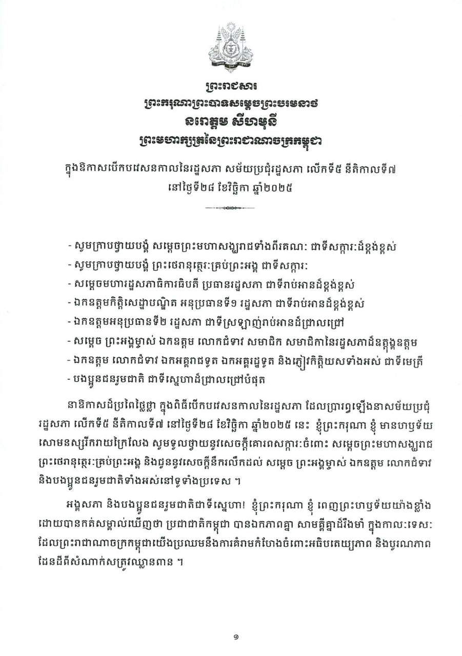 ព្រះរាជសារ ព្រះករុណាព្រះបាទសម្តេចព្រះបរមនាថ នរោត្តម សីហមុនី ព្រះមហាក្សត្រនៃព្រះរាជាណាចក្រកម្ពុជា ក្នុងឱកាសបើកបវេសនកាលនៃរដ្ឋសភា សម័យប្រជុំរដ្ឋសភា លើកទី៥ នីតិកាលទី៧ នៅថ្ងៃទី២៨ ខែវិច្ឆិកា ឆ្នាំ២០២៥__