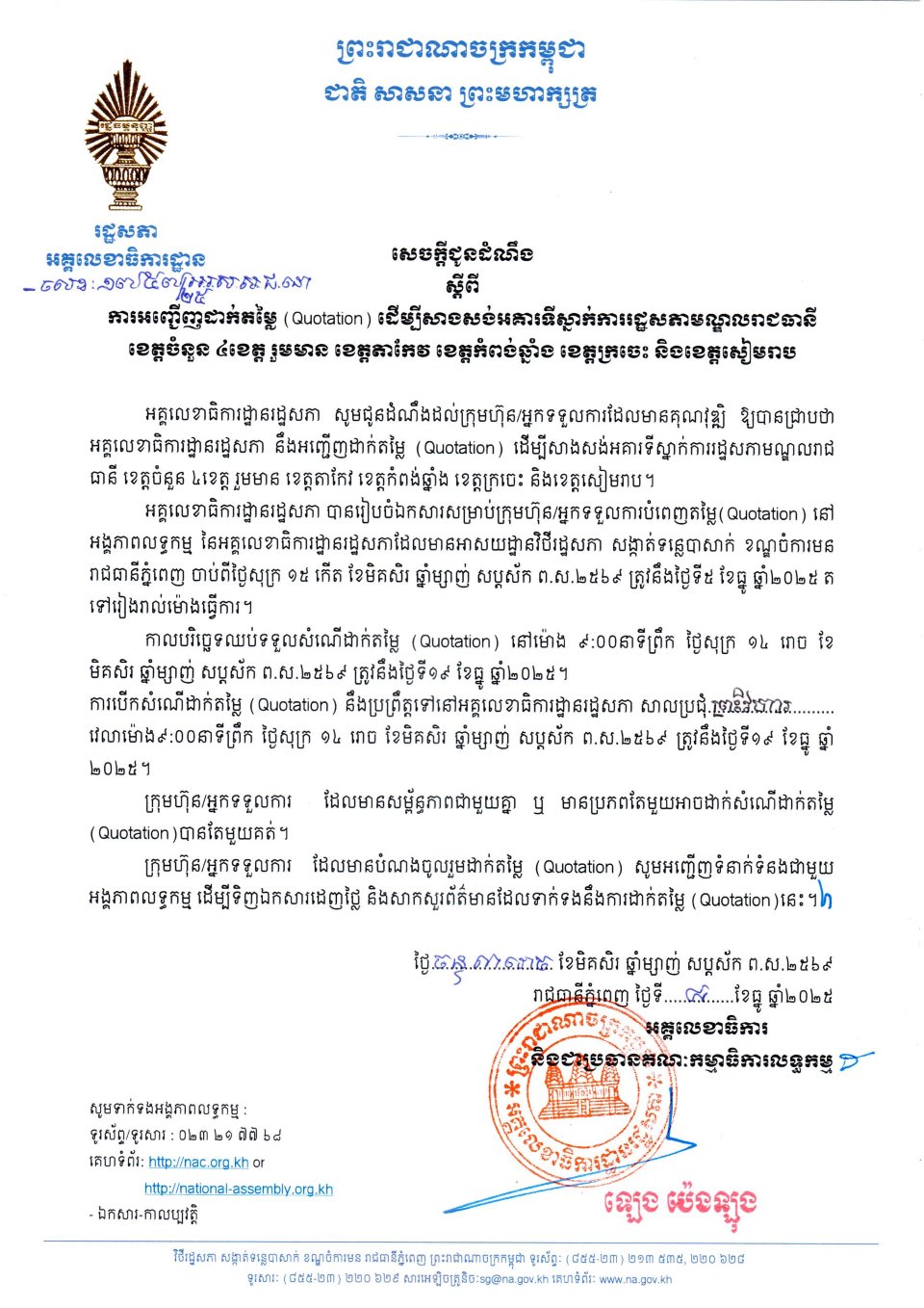 សេចក្តីជូនដំណឹង ស្តីពី ការអញ្ជើញដាក់តម្លៃ (Quotation) ដើម្បីសាងសង់អគារទីស្នាក់ការរដ្ឋសភាមណ្ឌលរាជធានី-ខេត្ត ចំនួន ៤ខេត្ត រួមមាន ខេត្តតាកែវ ខេត្តកំពង់ឆ្នាំង ខេត្តក្រចេះ និងខេត្តសៀមរាប