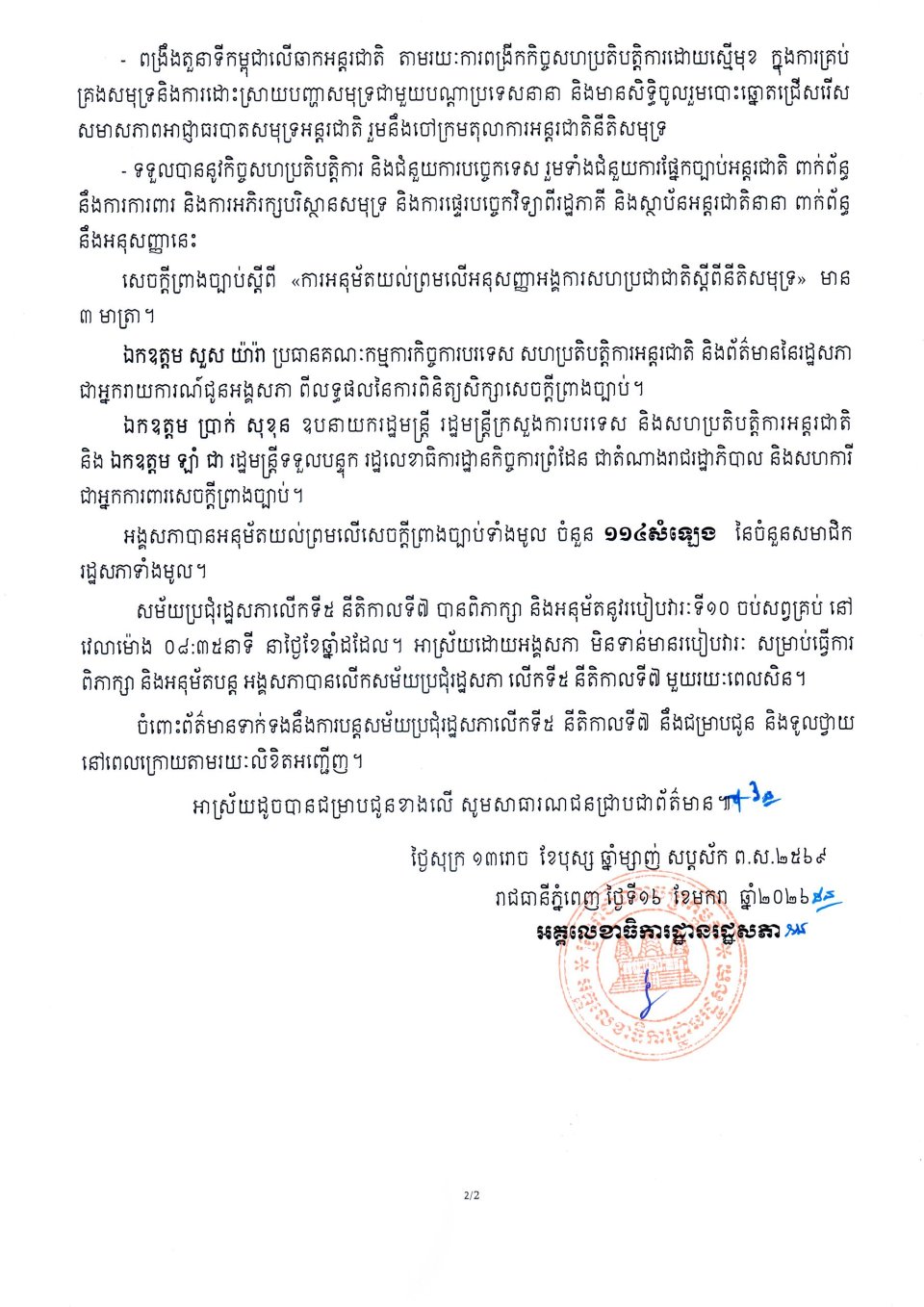 សេចក្តីប្រកាសព័ត៌មាន ស្តីពីលទ្ធផលសម័យប្រជុំរដ្ឋសភាលើកទី៥ នីតិកាលទី៧ ថ្ងៃសុក្រ ទី១៦ ខែមករា ឆ្នាំ២០២៦