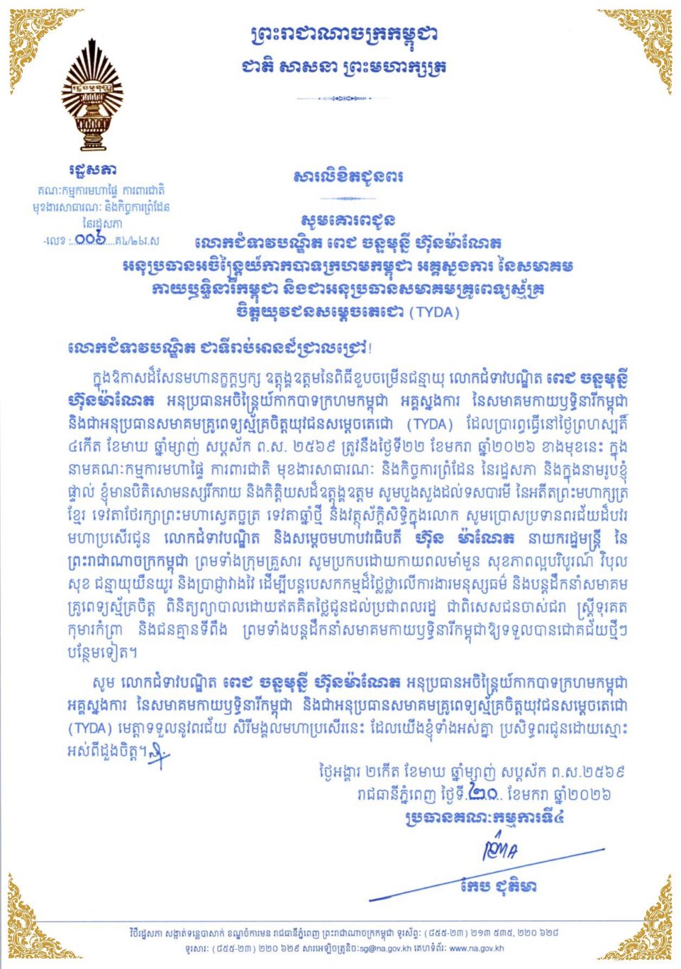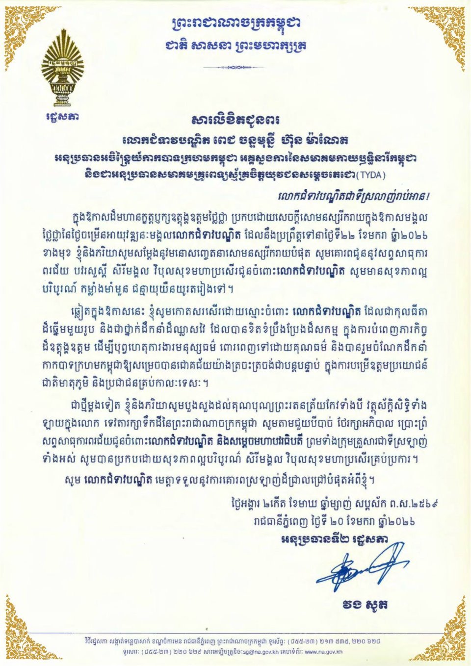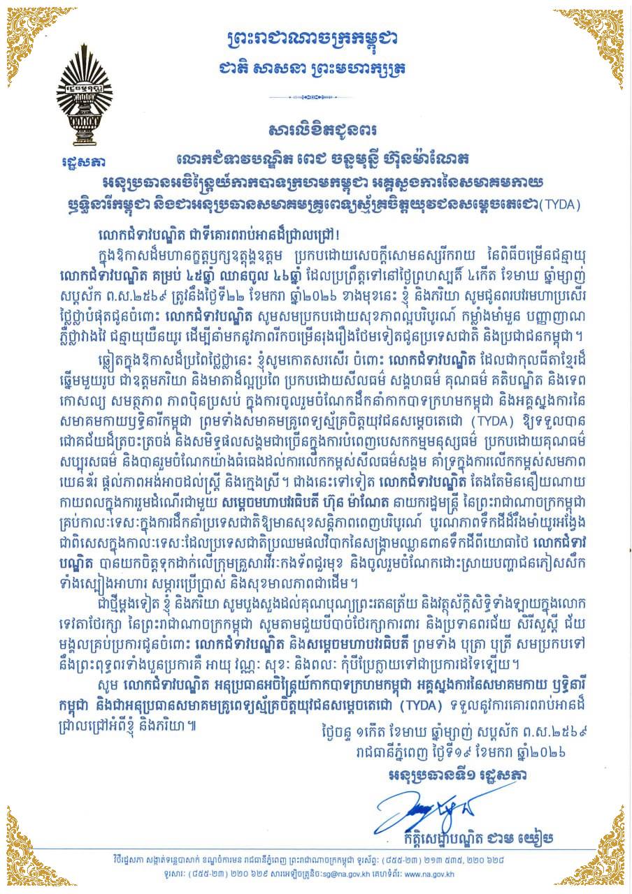 សម្តេចមហារដ្ឋសភាធិការធិបតី ឃួន សុដារី ប្រធានរដ្ឋសភា ព្រមទាំងថ្នាក់ដឹកនាំរដ្ឋសភា នៃព្រះរាជាណាចក្រកម្ពុជា ផ្ញេីសារលិខិតជូនពរ លោកជំទាវបណ្ឌិត ពេជ ចន្ទមុន្នី ហ៊ុនម៉ាណែត អនុប្រធានអចិន្ត្រៃយ៍កាកបាទក្រហមកម្ពុជា អគ្គស្នងការនៃសមាគមកាយឫទ្ធិនារីកម្ពុជា និងជា អនុប្រធានសមាគមគ្រូពេទ្យស្ម័គ្រចិត្តយុវជនសម្តេចតេជោ (TYDA)