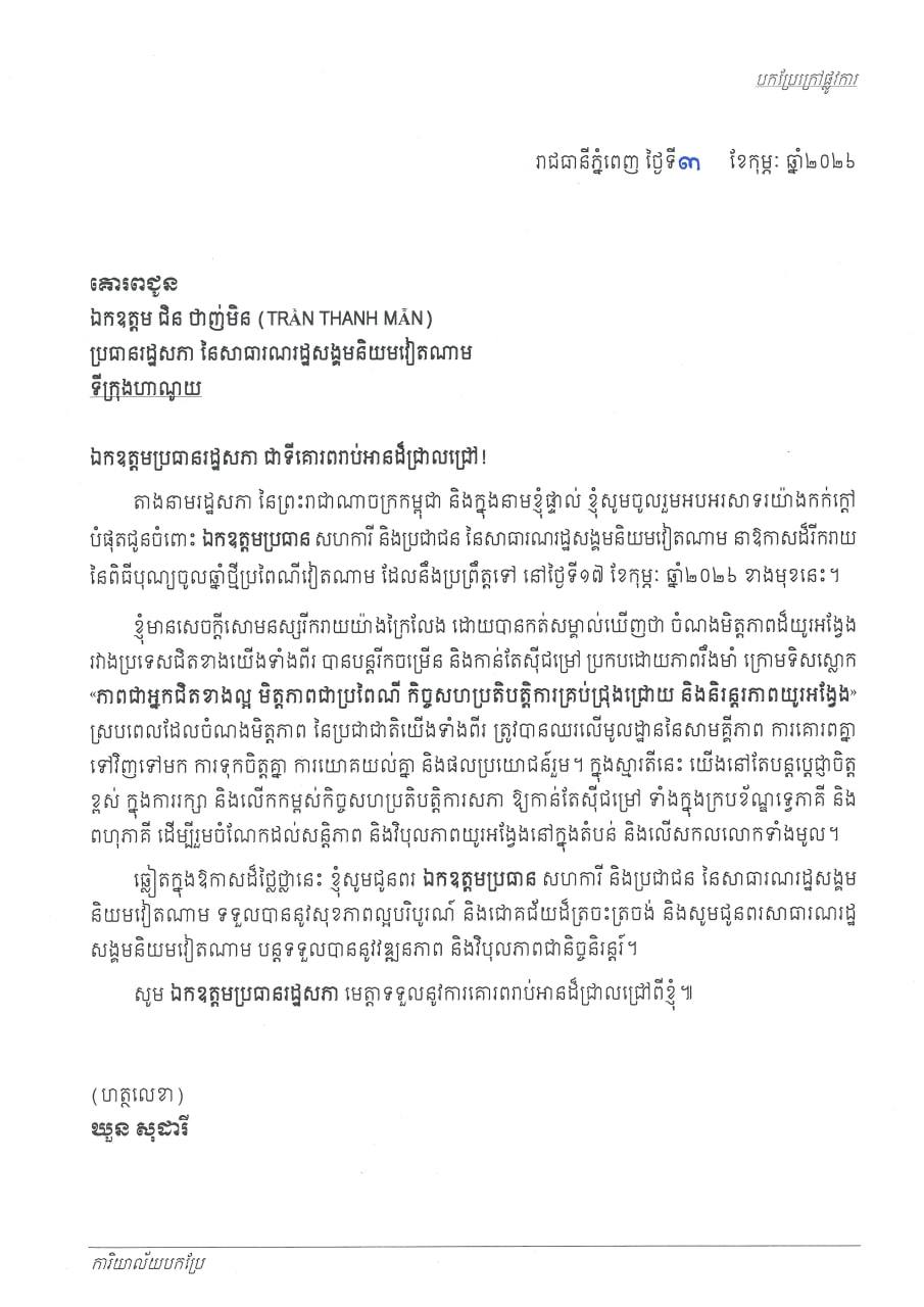 សម្តេចមហារដ្ឋសភាធិការធិបតី ឃួន សុដារី ប្រធានរដ្ឋសភា នៃព្រះរាជាណាចក្រកម្ពុជា ផ្ញេីសារលិខិតអបអរសាទរ គោរពជូន ឯកឧត្តម ជិន ថាញ់មិន (TRẦN THANH MÃN) ប្រធានរដ្ឋសភា នៃសាធារណរដ្ឋសង្គមនិយមវៀតណាម