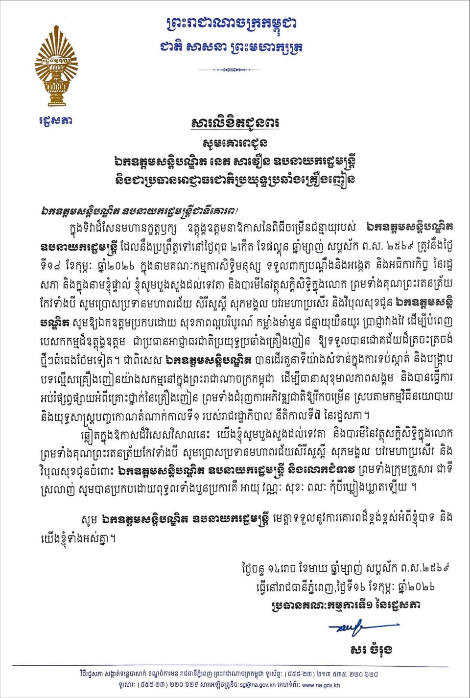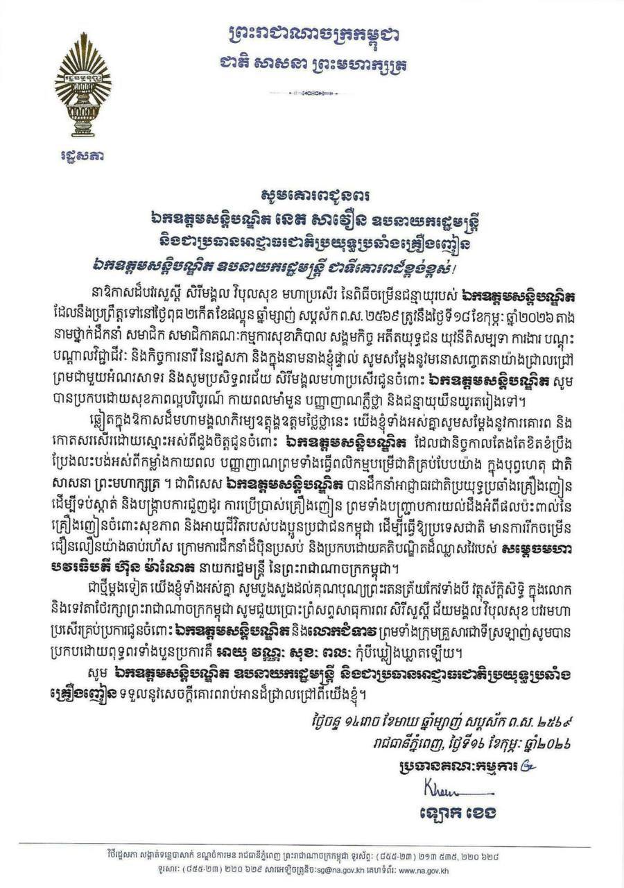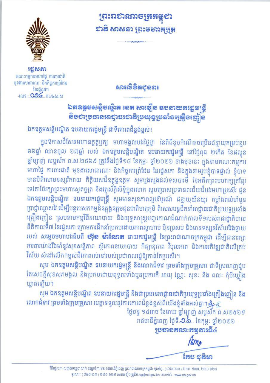 សម្តេចមហារដ្ឋសភាធិការធិបតី ឃួន សុដារី ប្រធានរដ្ឋសភា ព្រមទាំងថ្នាក់ដឹកនាំរដ្ឋសភា នៃព្រះរាជាណាចក្រកម្ពុជា ផ្ញើសារលិខិតជូនពរ ជូន ឯកឧត្តមសន្តិបណ្ឌិត នេត សាវឿន ឧបនាយករដ្ឋមន្ត្រី និងជាប្រធានអាជ្ញាធរជាតិប្រយុទ្ធប្រឆាំងគ្រឿងញៀន