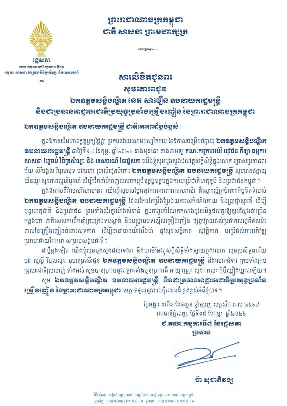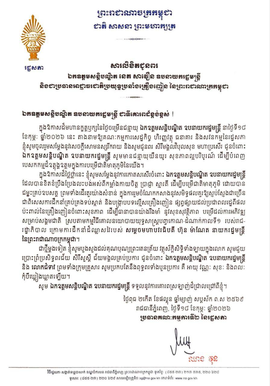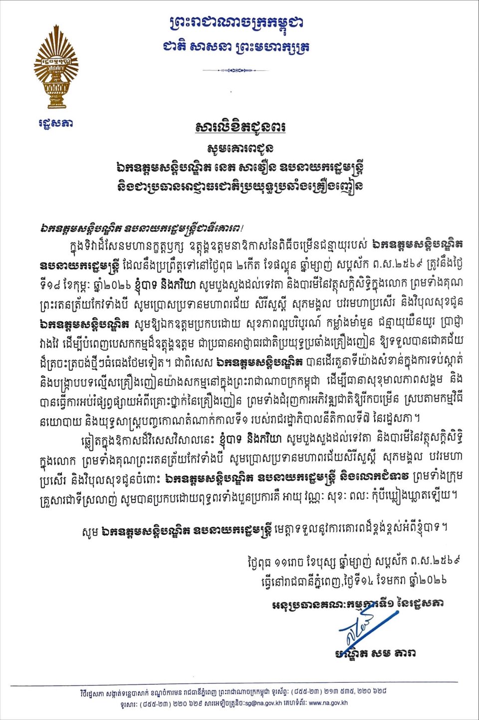 សម្តេចមហារដ្ឋសភាធិការធិបតី ឃួន សុដារី ប្រធានរដ្ឋសភា ព្រមទាំងថ្នាក់ដឹកនាំរដ្ឋសភា នៃព្រះរាជាណាចក្រកម្ពុជា ផ្ញើសារលិខិតជូនពរ ជូន ឯកឧត្តមសន្តិបណ្ឌិត នេត សាវឿន ឧបនាយករដ្ឋមន្ត្រី និងជាប្រធានអាជ្ញាធរជាតិប្រយុទ្ធប្រឆាំងគ្រឿងញៀន