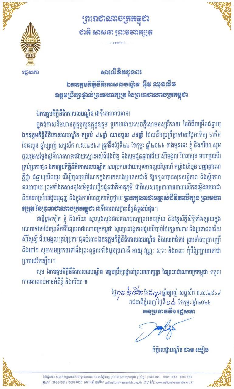 សម្តេចមហារដ្ឋសភាធិការធិបតី ឃួន សុដារី ប្រធានរដ្ឋសភា ព្រមទាំងថ្នាក់ដឹកនាំរដ្ឋសភា នៃព្រះរាជាណាចក្រកម្ពុជា ផ្ញើសារលិខិតជូនពរ ជូន ឯកឧត្តមកិត្តិនីតិកោសលបណ្ឌិត អ៊ឹម ឈុនលឹម ឧត្តមប្រឹក្សាផ្ទាល់ព្រះមហាក្សត្រ នៃព្រះរាជាណាចក្រកម្ពុជា