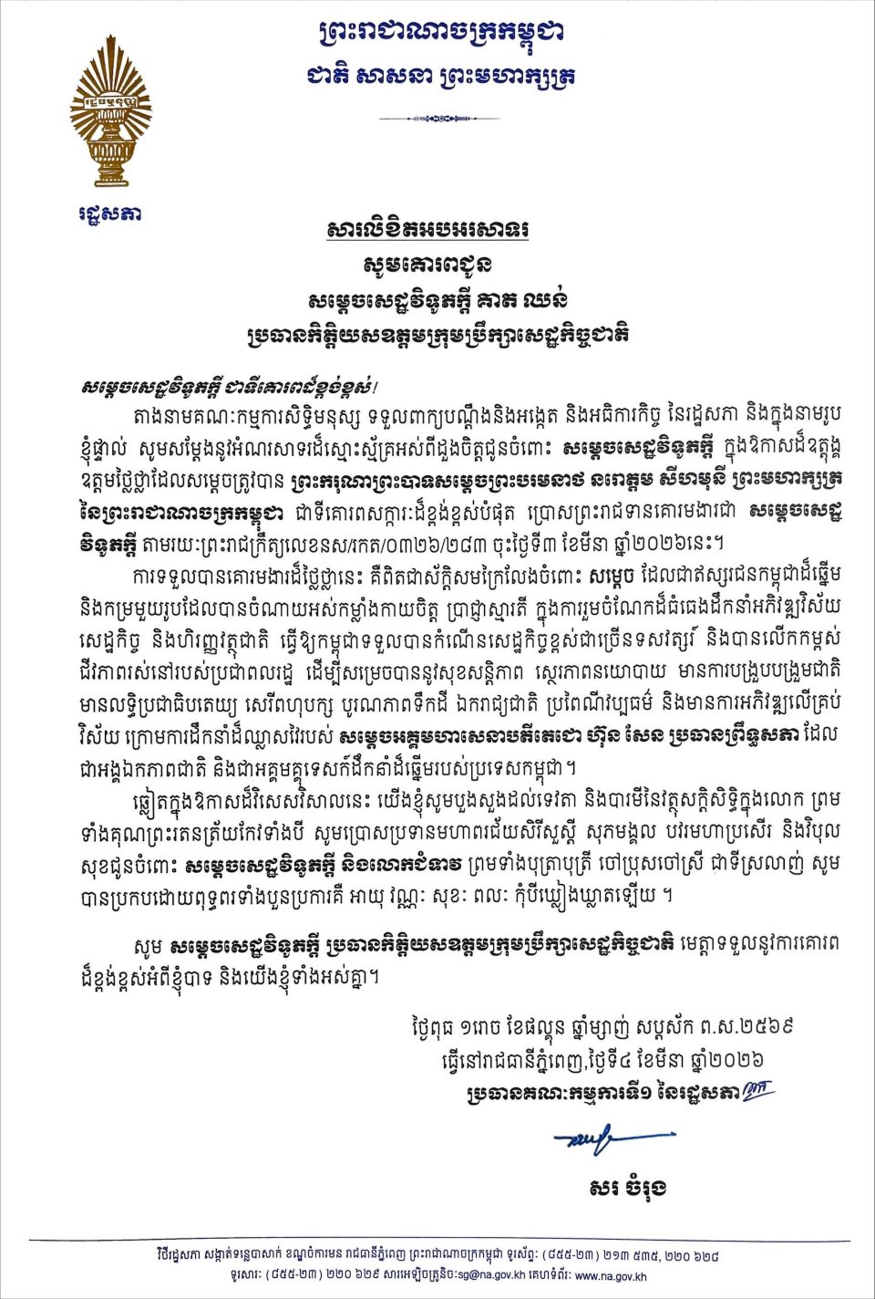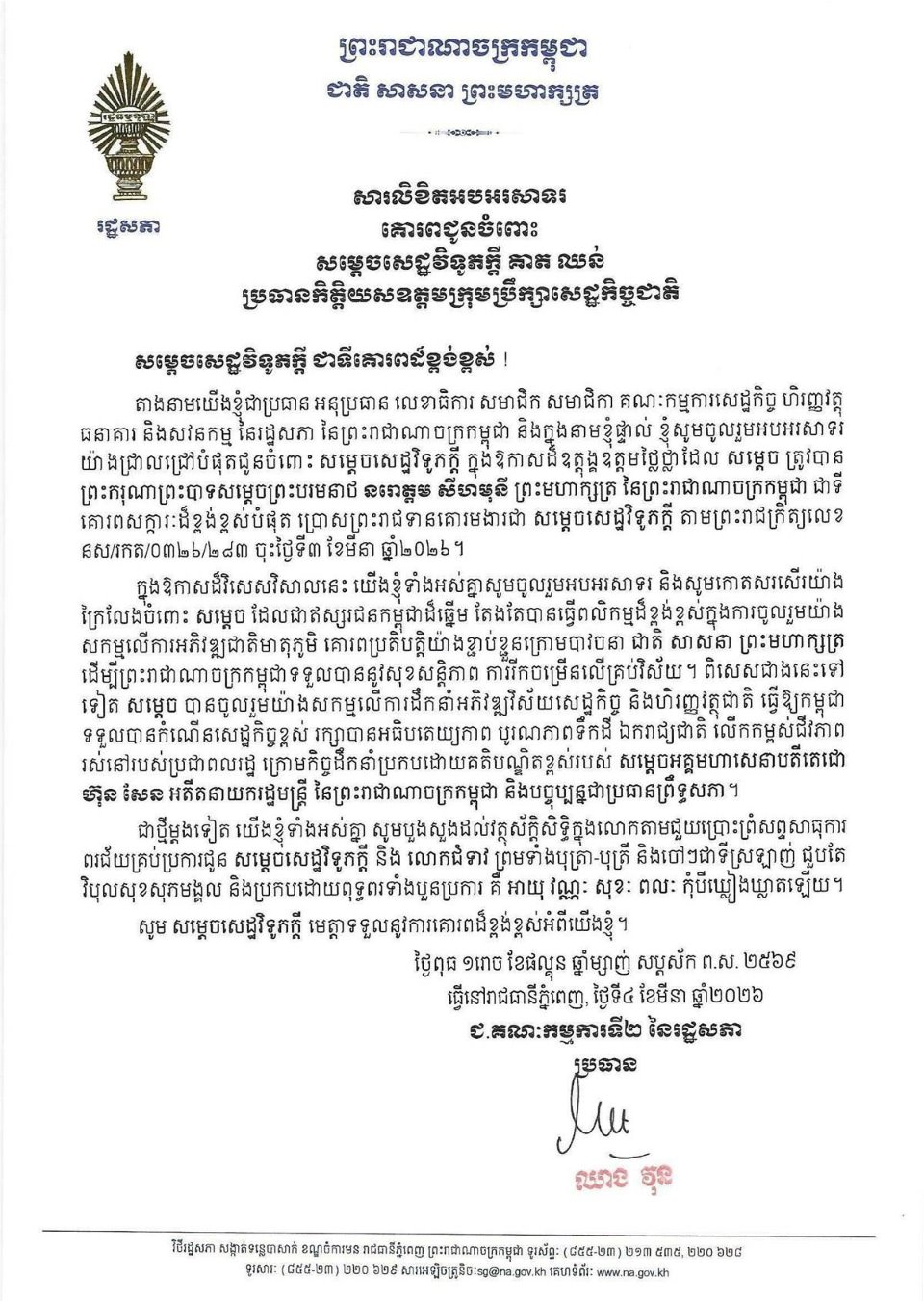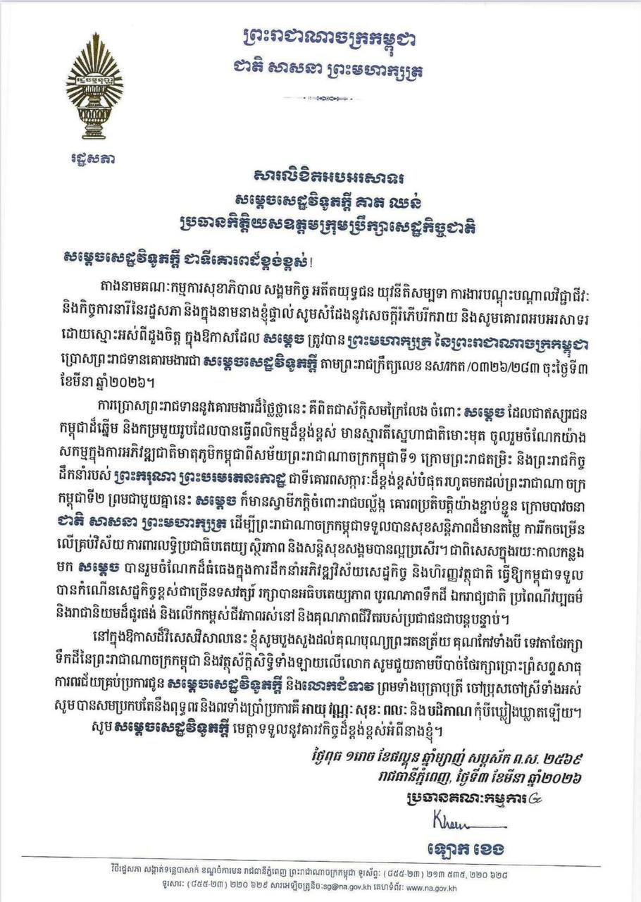 សម្តេចមហារដ្ឋសភាធិការធិបតី ឃួន សុដារី ប្រធានរដ្ឋសភា នៃព្រះរាជាណាចក្រកម្ពុជា ព្រមទាំង សមាជិក សមាជិការដ្ឋសភា ផ្ញើសារលិខិតអបអរសាទរ និងសូមគោរពជូនពរ សម្តេចសេដ្ឋវិទូភក្តី គាត ឈន់ ឧត្តមប្រឹក្សាផ្ទាល់ព្រះមហាក្សត្រ នៃព្រះរាជាណាចក្រកម្ពុជា និងជាប្រធានកិត្តិយសឧត្តមក្រុមប្រឹក្សាសេដ្ឋកិច្ច
