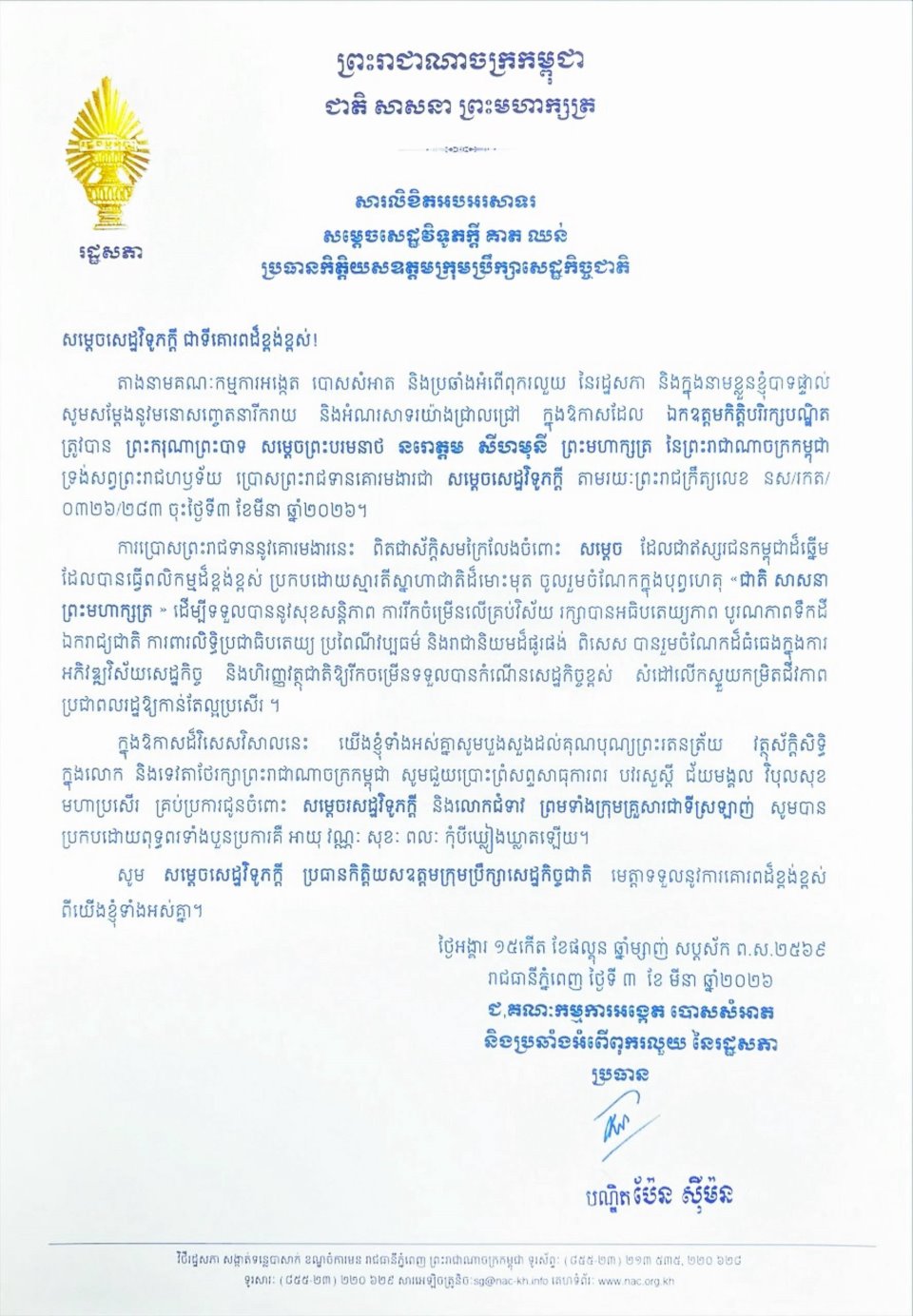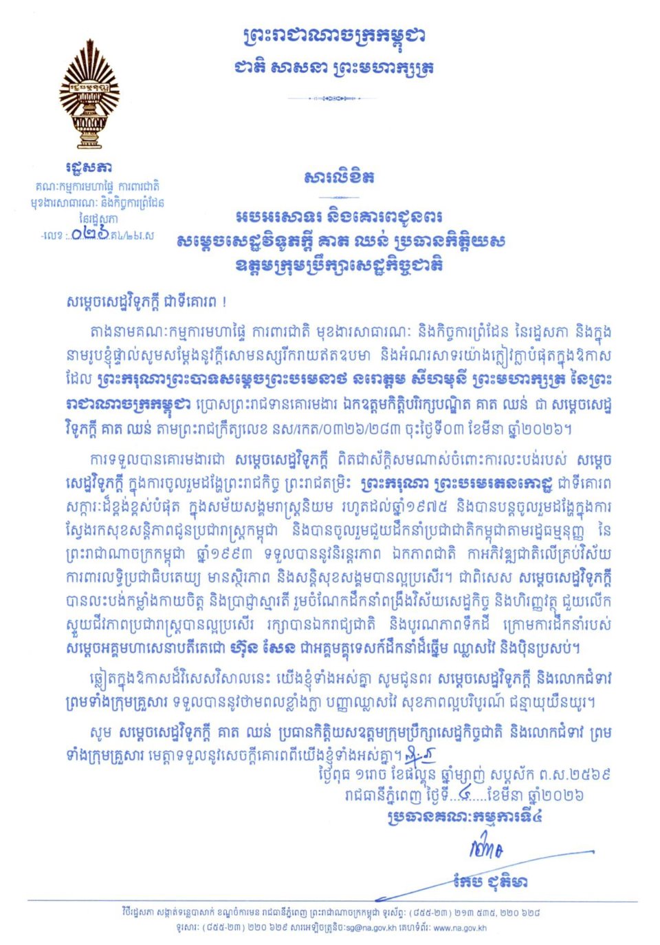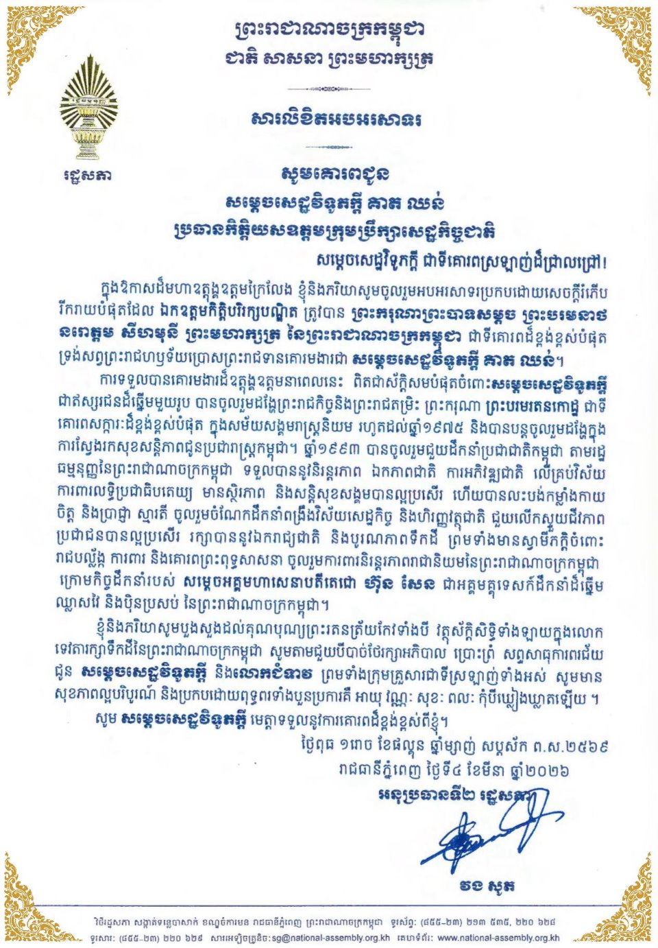 សម្តេចមហារដ្ឋសភាធិការធិបតី ឃួន សុដារី ប្រធានរដ្ឋសភា នៃព្រះរាជាណាចក្រកម្ពុជា ព្រមទាំង សមាជិក សមាជិការដ្ឋសភា ផ្ញើសារលិខិតអបអរសាទរ និងសូមគោរពជូនពរ សម្តេចសេដ្ឋវិទូភក្តី គាត ឈន់ ឧត្តមប្រឹក្សាផ្ទាល់ព្រះមហាក្សត្រ នៃព្រះរាជាណាចក្រកម្ពុជា និងជាប្រធានកិត្តិយសឧត្តមក្រុមប្រឹក្សាសេដ្ឋកិច្ច