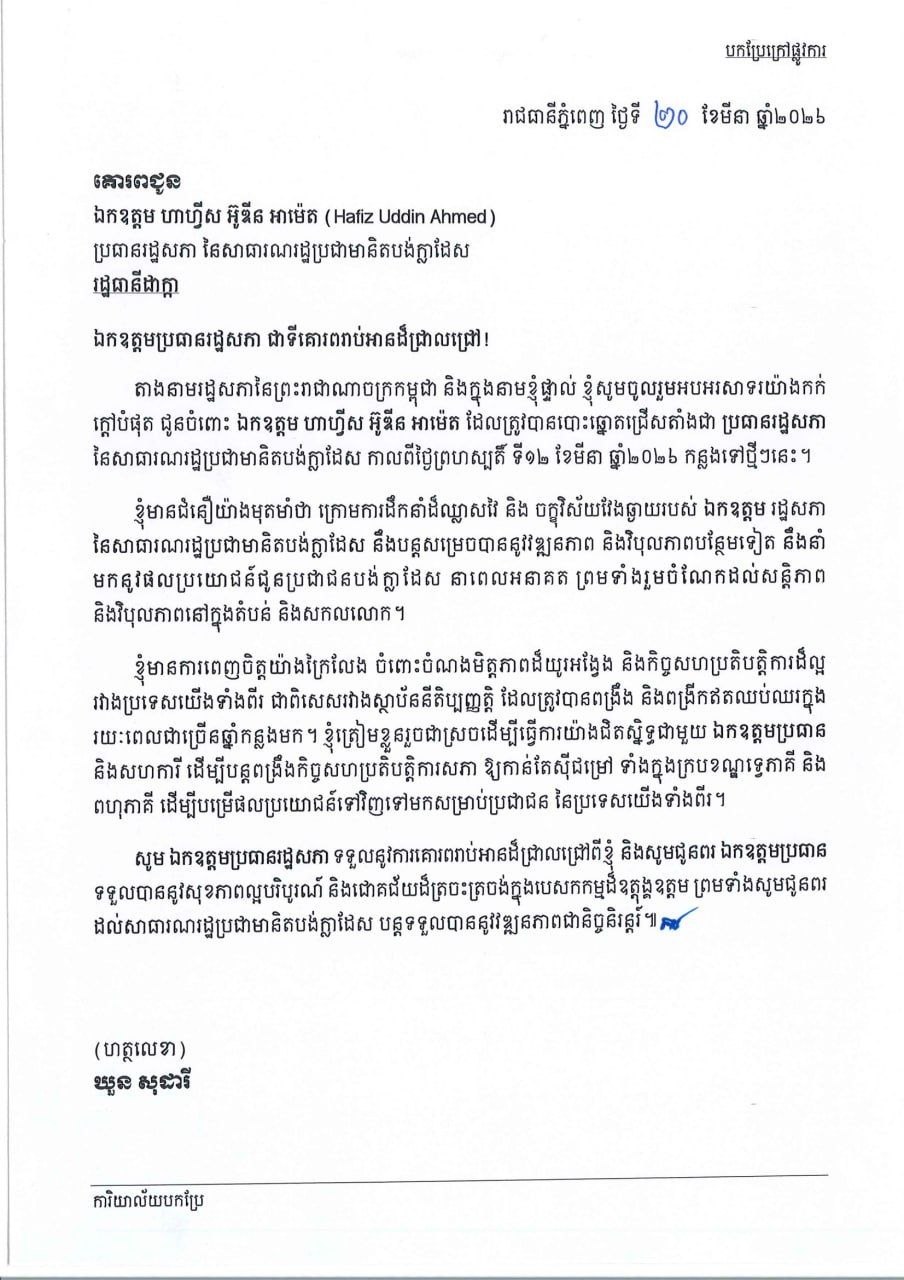 សម្តេចមហារដ្ឋសភាធិការធិបតី ឃួន សុដារី ប្រធានរដ្ឋសភានៃព្រះរាជាណាចក្រកម្ពុជា ផ្ញើសារលិខិតអបអរសាទរយ៉ាងកក់ក្តៅបំផុតជូនចំពោះ ឯកឧត្តម ហាហ្វីស អ៊ូឌីន អាម៉េត (Hafiz Uddin Ahmed)