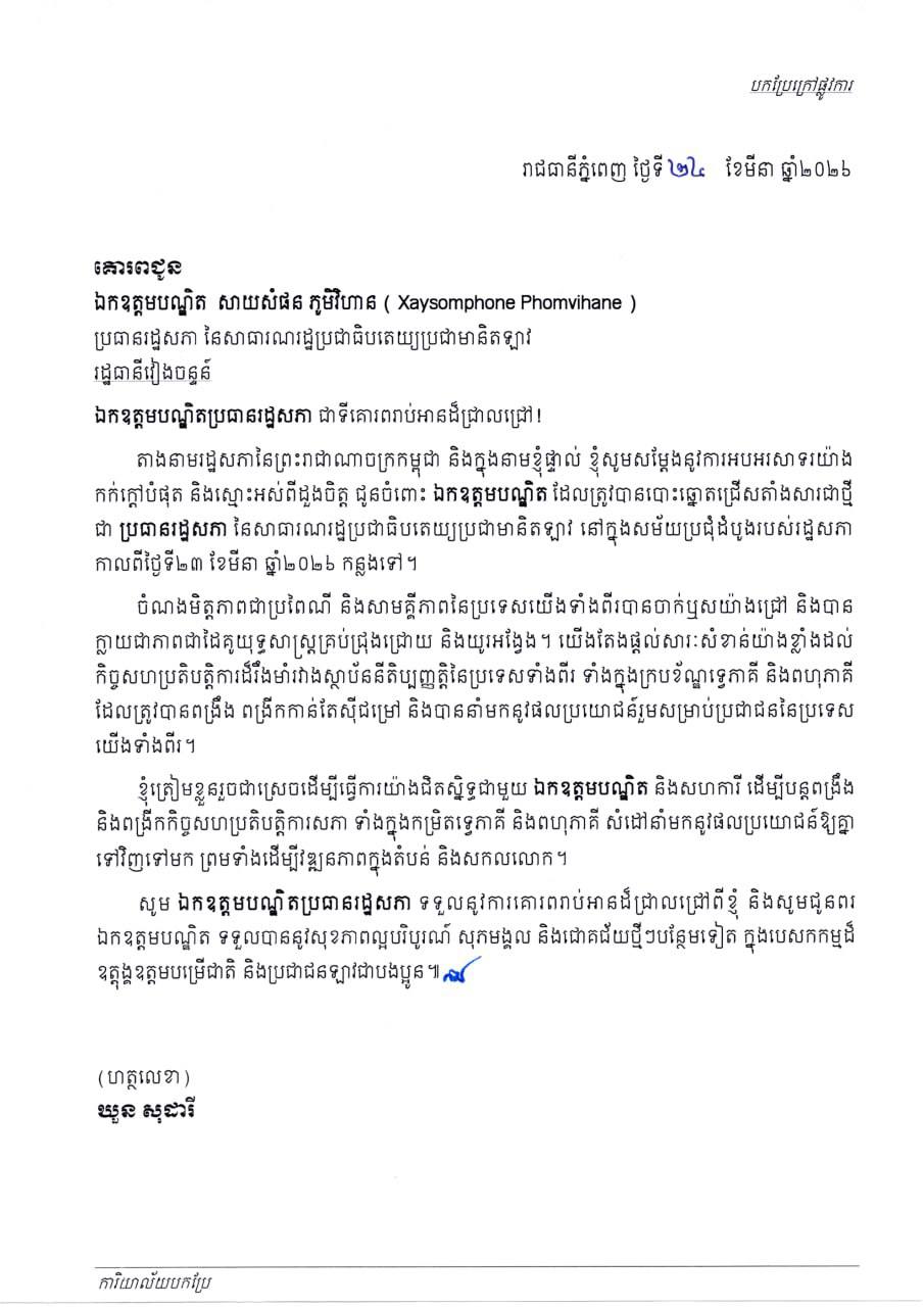 សម្តេចមហារដ្ឋសភាធិការធិបតី ឃួន សុដារី ប្រធានរដ្ឋសភា នៃព្រះរាជាណាចក្រកម្ពុជា ផ្ញេីសារលិខិតអបអរសាទរ គោរពជូន ឯកឧត្តមបណ្ឌិត សាយសំផន ភូមិវិហាន (Xaysomphone Phomvihane) ប្រធានរដ្ឋសភា នៃសាធារណរដ្ឋប្រជាធិបតេយ្យប្រជាមានិតឡាវ