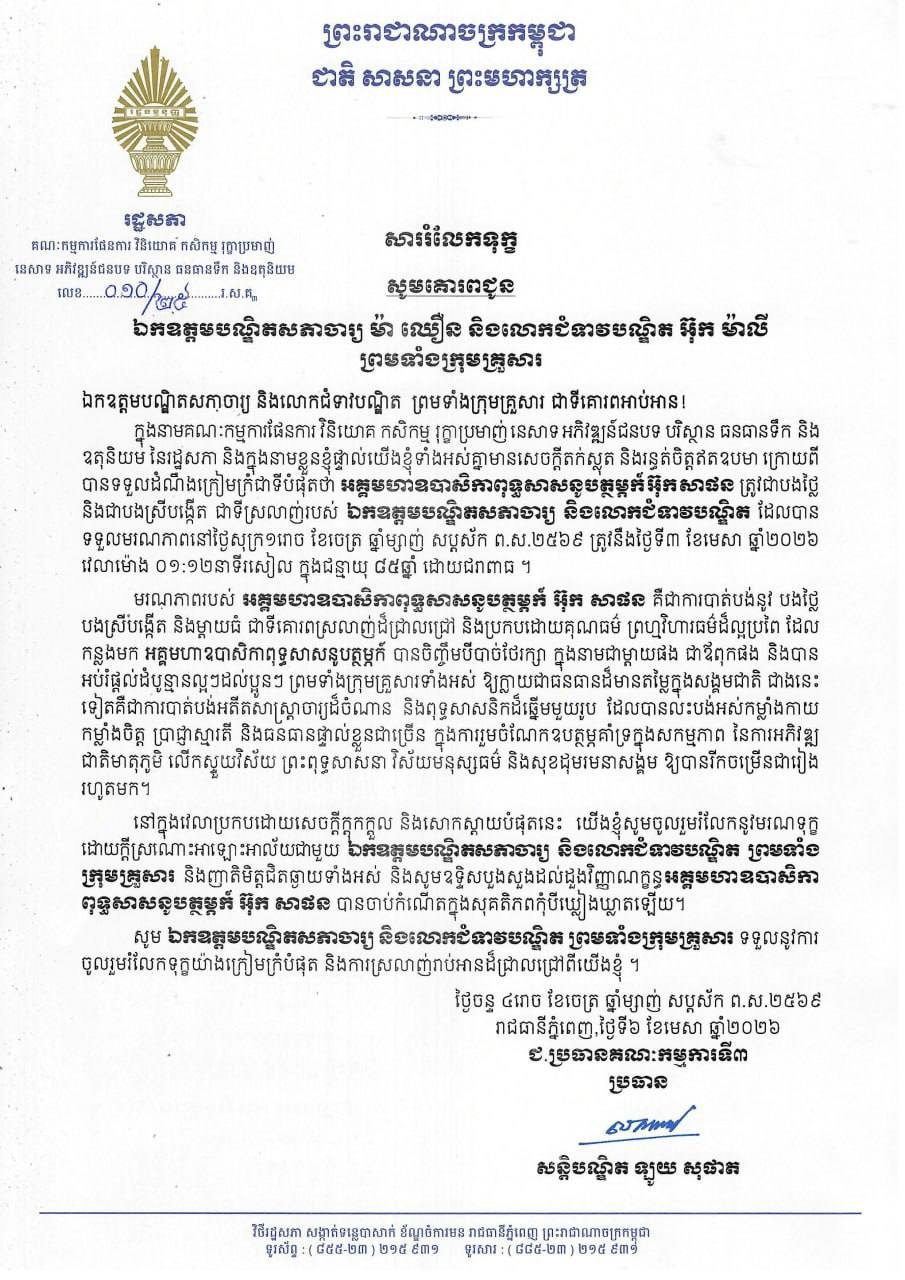 សម្តេចមហារដ្ឋសភាធិការធិបតី ឃួន សុដារី ប្រធានរដ្ឋសភា នៃព្រះរាជាណាចក្រកម្ពុជា ព្រមទាំងសមាជិក សមាជិការដ្ឋសភា ផ្ញើសារលិខិតរំលែកមរណទុក្ខ ជូន លោកជំទាវបណ្ឌិត អ៊ុក ម៉ាលី និង ឯកឧត្តមបណ្ឌិតសភាចារ្យ ម៉ា ឈឿន ព្រមទាំងក្រុមគ្រួសារ ចំពោះមរណភាពរបស់ អគ្គមហាឧបាសិកាពុទ្ធសាសនូបត្ថម្ភក៍ អ៊ុក សាផន